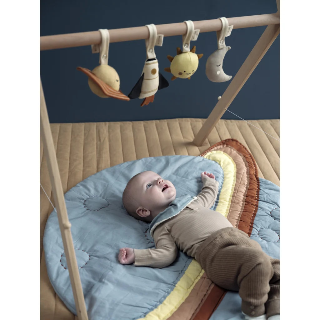 Fabelab's Activity toy - Spaceship is the perfect toy for those tiny, curious baby hands. Click it on to the baby gym, bed side or stroller and your little one will get hours of fun exploring the beautiful colours, fabric texture and captivating sounds.