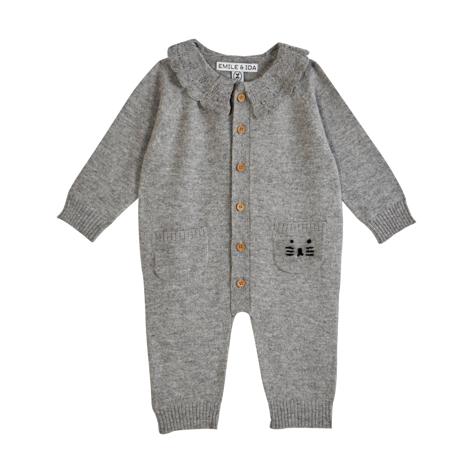 Baby jumpsuit in organic caramel cotton jersey, embroidered " Bonjour toi ! ". We love everything about this jumpsuit: the tone-on-tone ribbing at the neckline, cuffs, and ankles, the snaps that close the opening in the back and run down the legs for easy dressing and changing, the two patch pockets sewn on the thighs and closed with a wooden button, not to mention the message embroidered in red bouclette on the chest.
