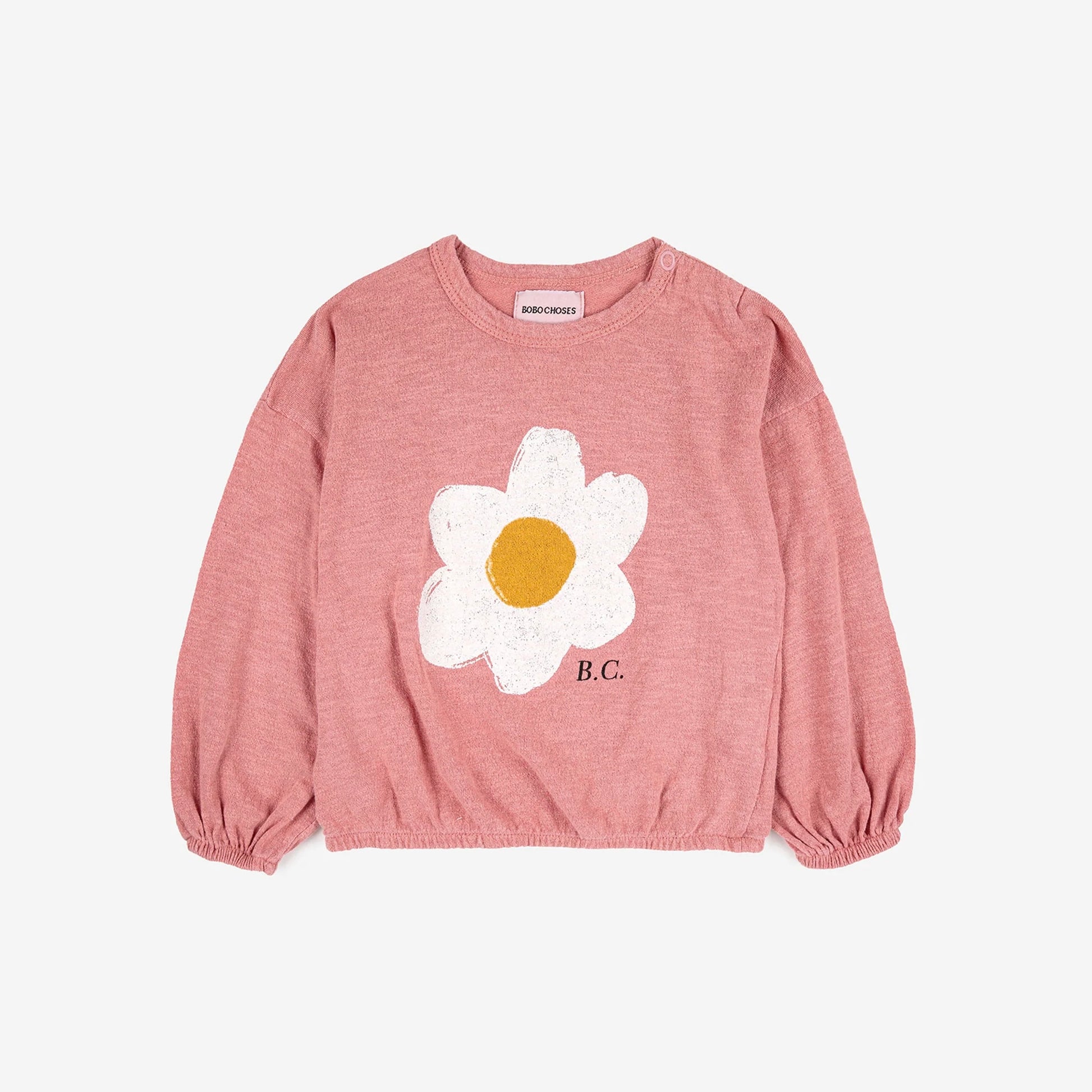 100% organic cotton salmon pink long sleeve t-shirt. Designed with long sleeves, dropped shoulder, shoulder snap fastening, elasticated bottom and elasticated cuffs. It has a loose fit. Made in Spain.