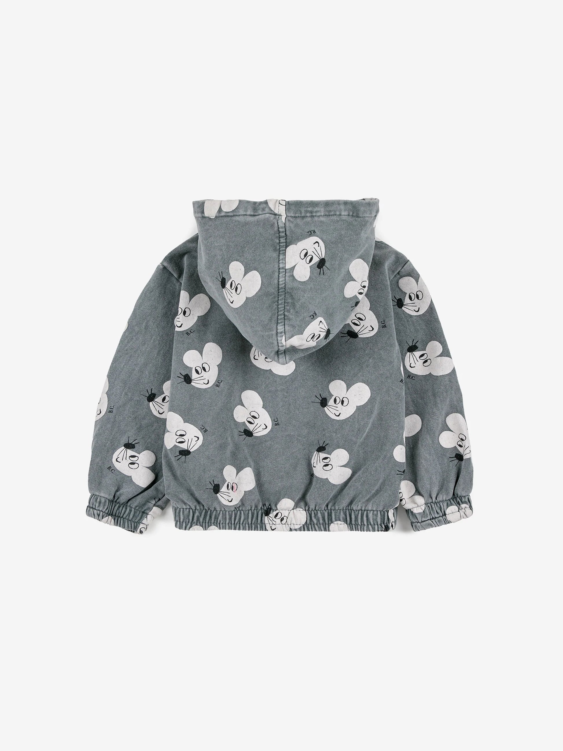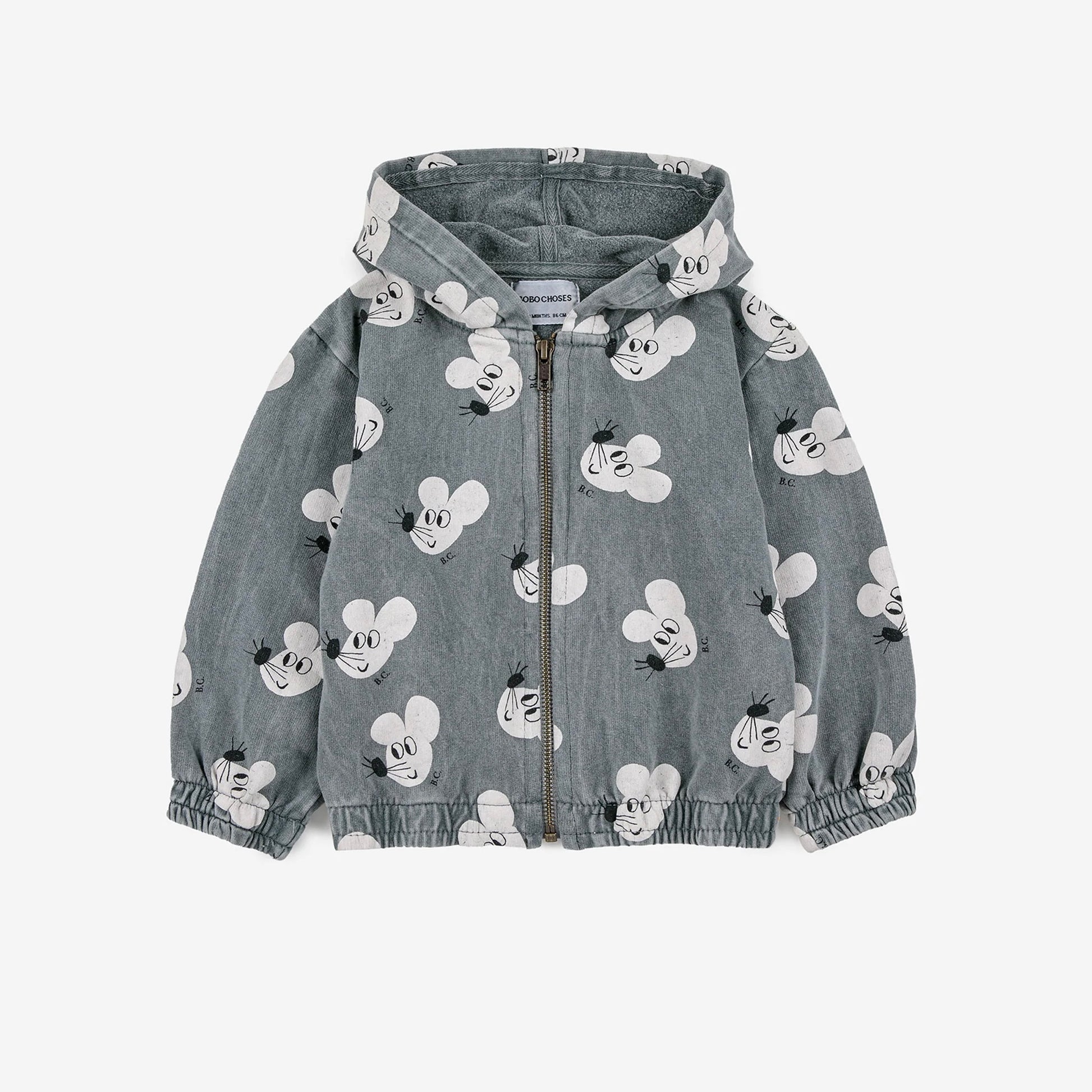 94% organic cotton 6% elastane grey sweatshirt. Designed with hooded, long sleeves, dropped shoulder, zipped, elasticated bottom and elasticated cuffs. It has a loose fit. Made in Spain.