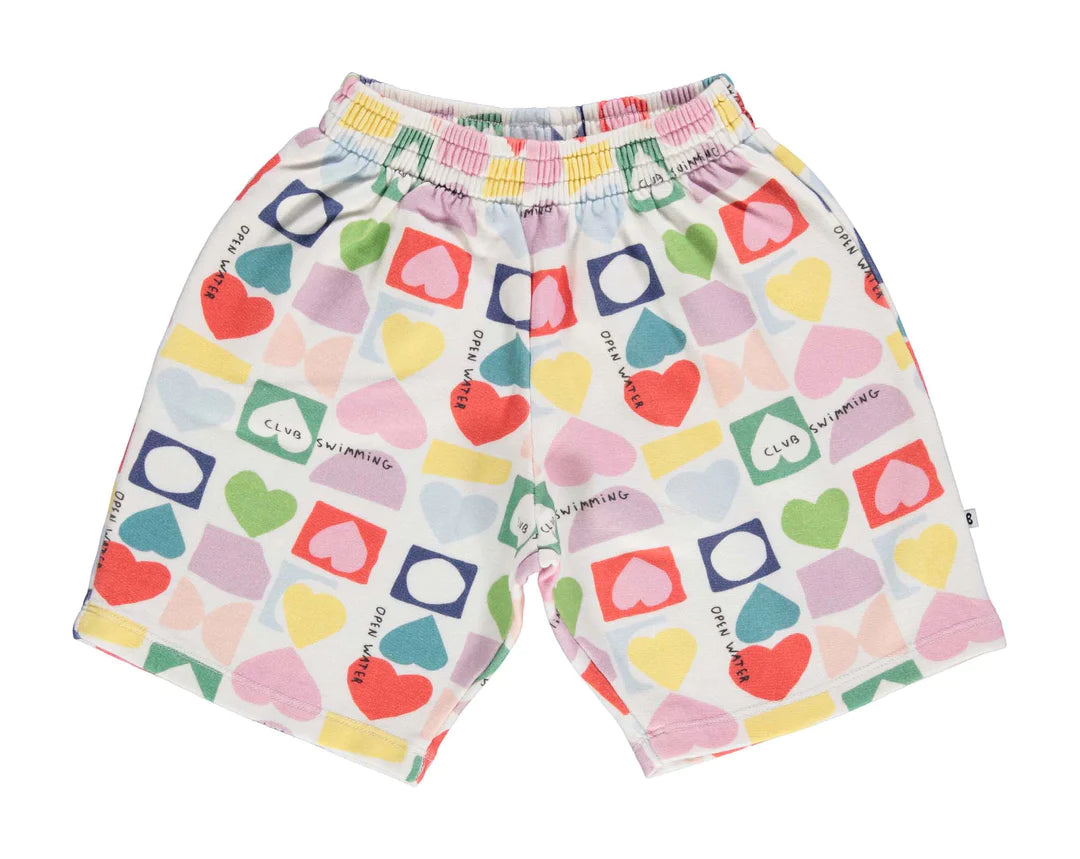 With cut-out hearts on a natural coloured background, these shorts are made from organic recycled fibres. An elastic waist, back pocket and easy fit, make for a comfortable option for freewheeling explorers.