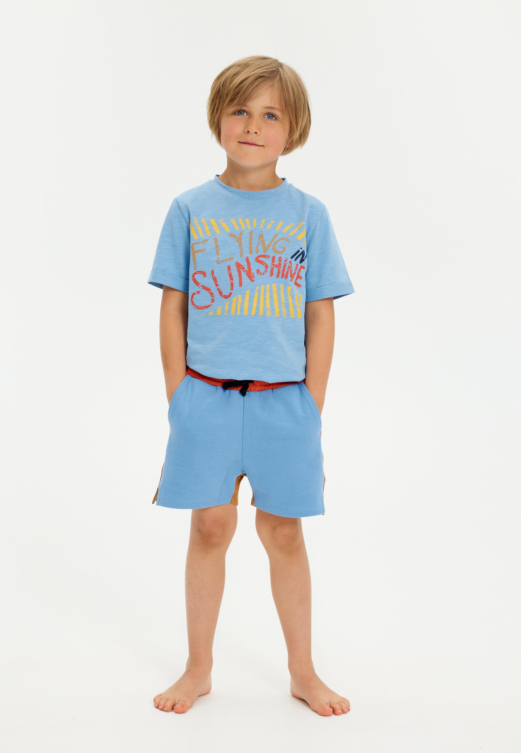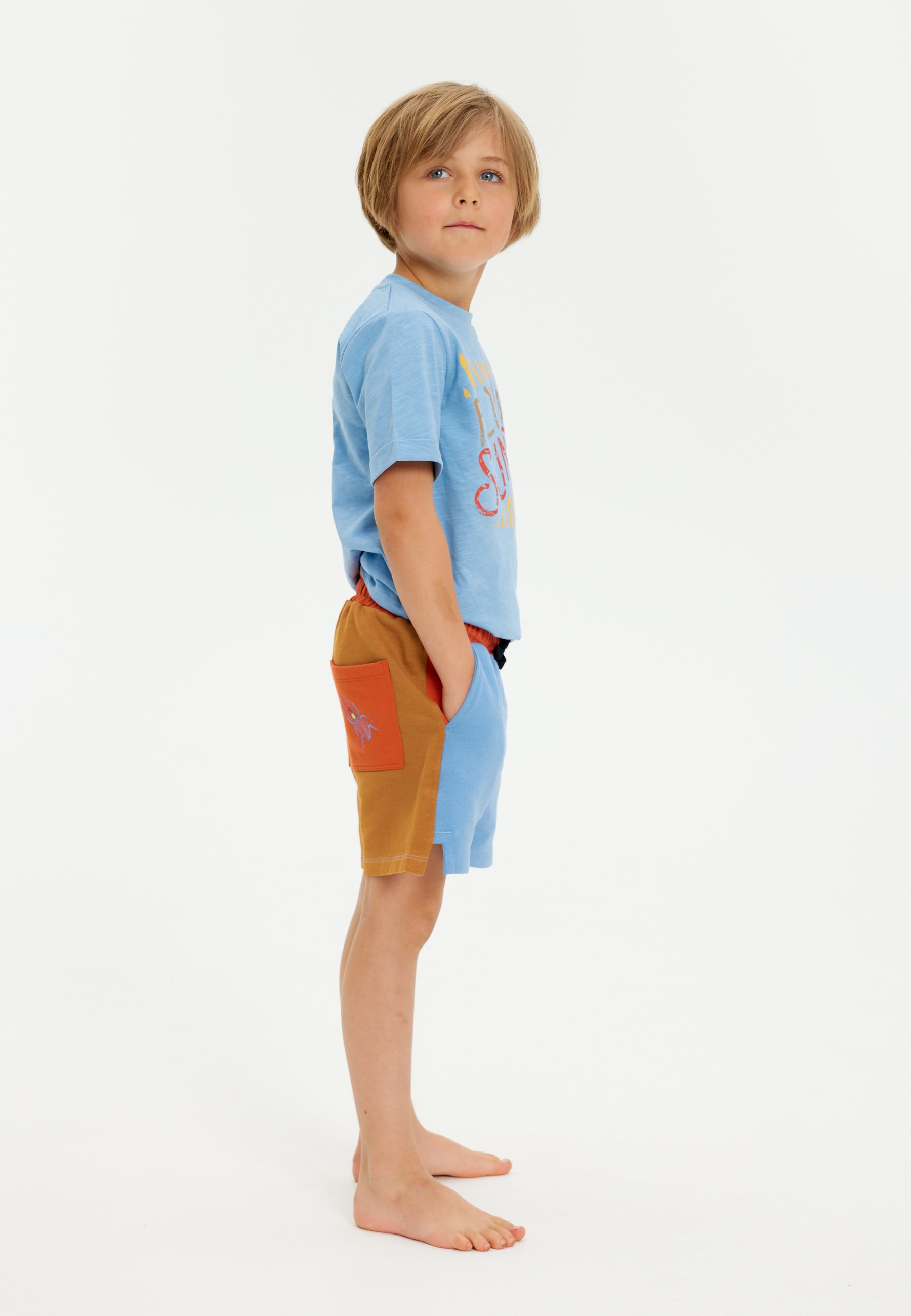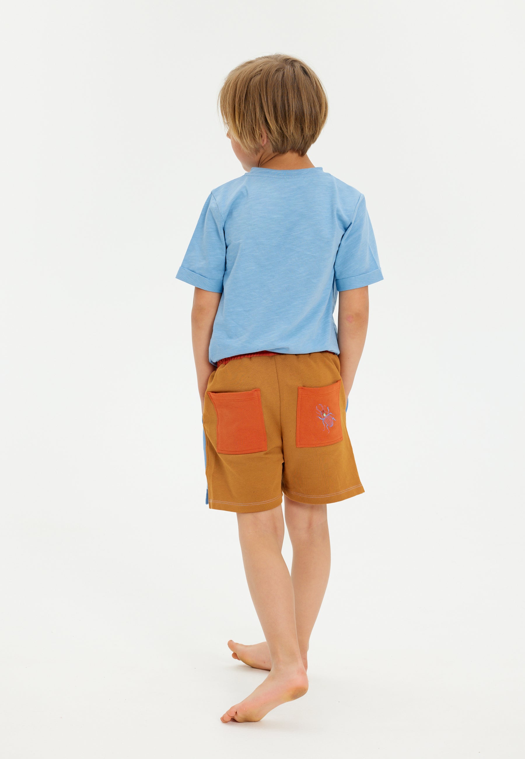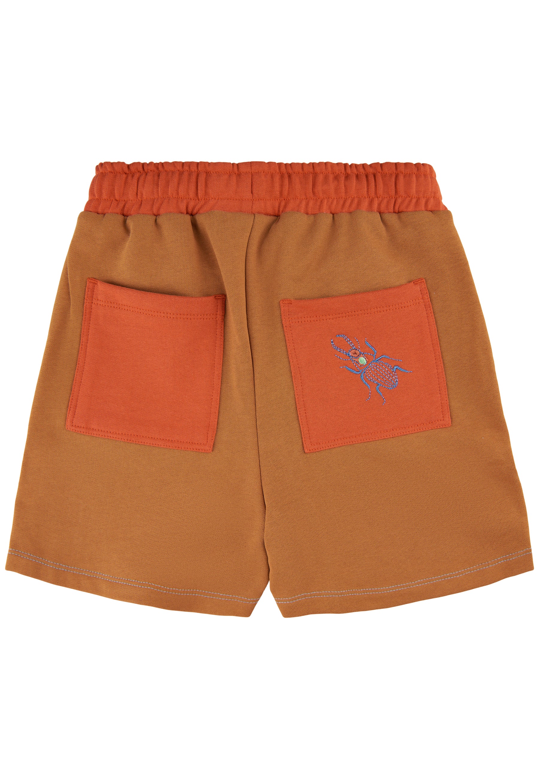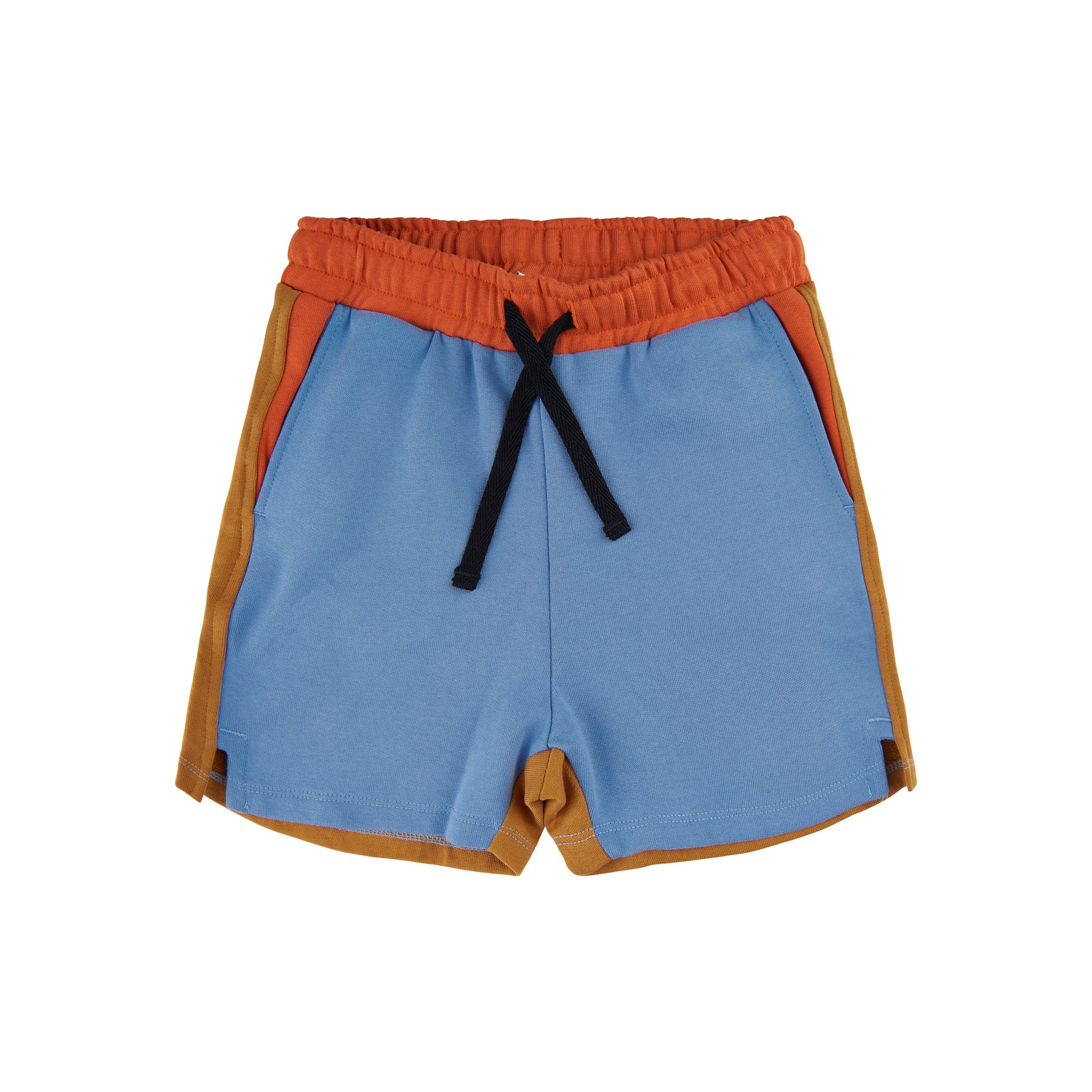 Colourful and casual shorts with cool contrasting colours in colour blocks. A sweet little embroidery on one of pockets on the back.