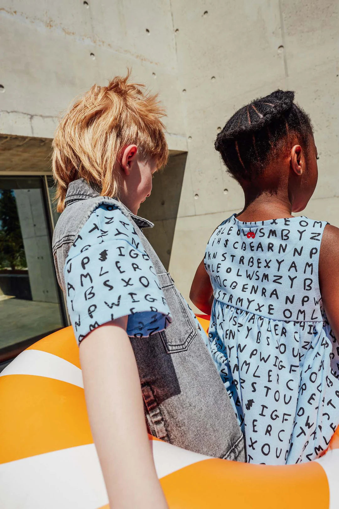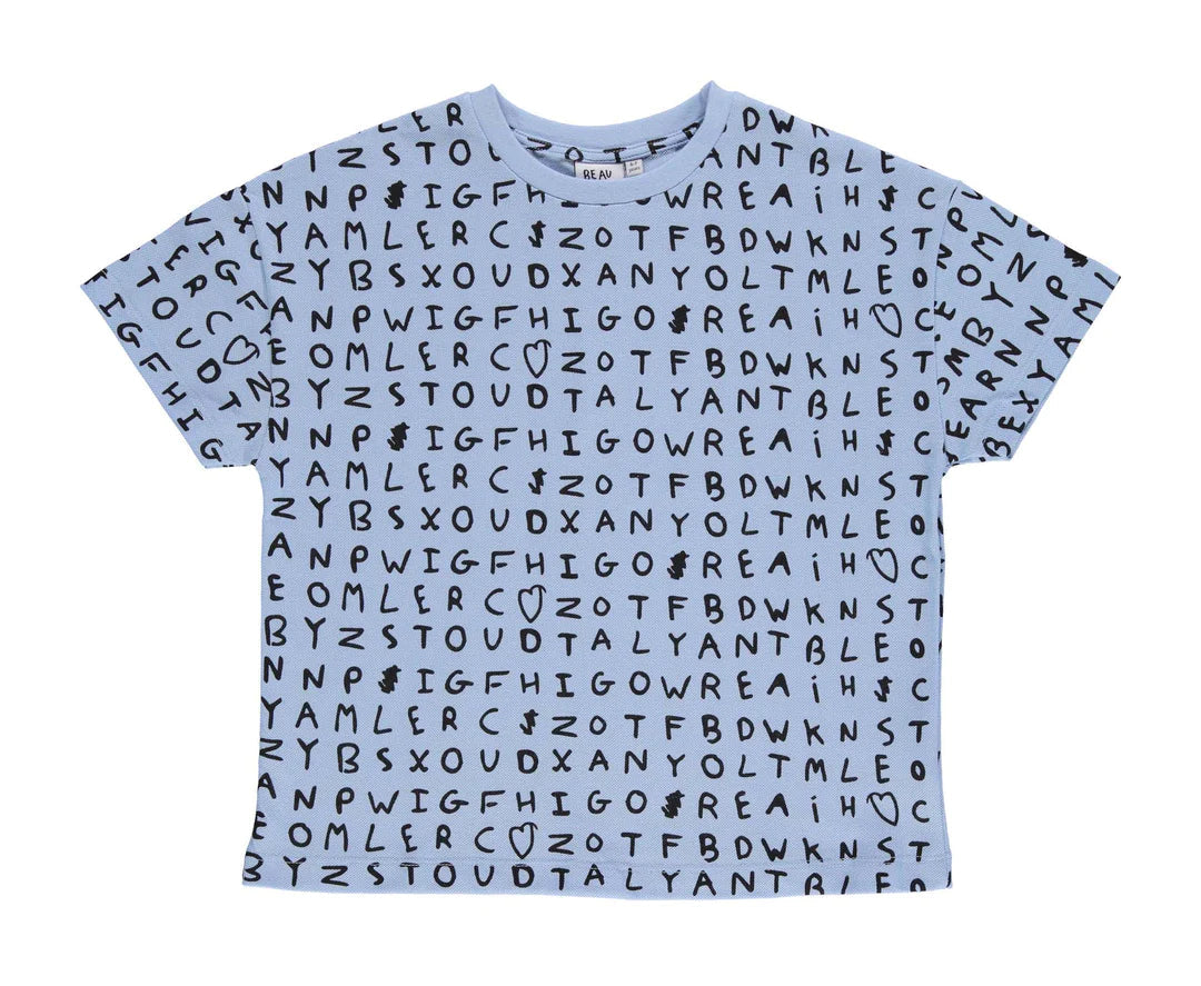 This relaxed fit t-shirt in Beau's handwritten alphabet font print features a ribbed collar and short sleeves. Our signature embroidered superhero mask is at the nape of the neck.
