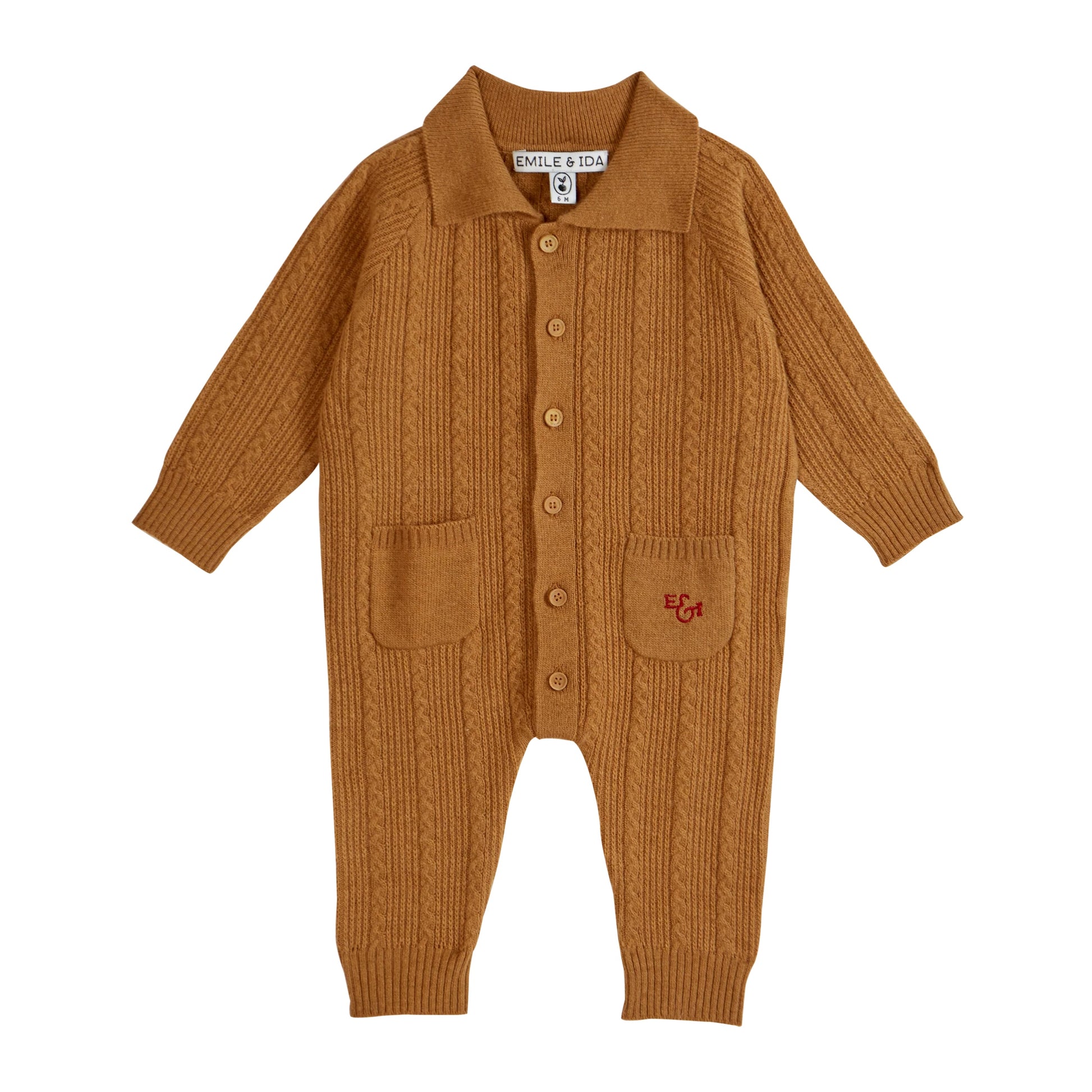Baby jumpsuit in organic caramel cotton jersey, embroidered " Bonjour toi ! ". We love everything about this jumpsuit: the tone-on-tone ribbing at the neckline, cuffs, and ankles, the snaps that close the opening in the back and run down the legs for easy dressing and changing, the two patch pockets sewn on the thighs and closed with a wooden button, not to mention the message embroidered in red bouclette on the chest.