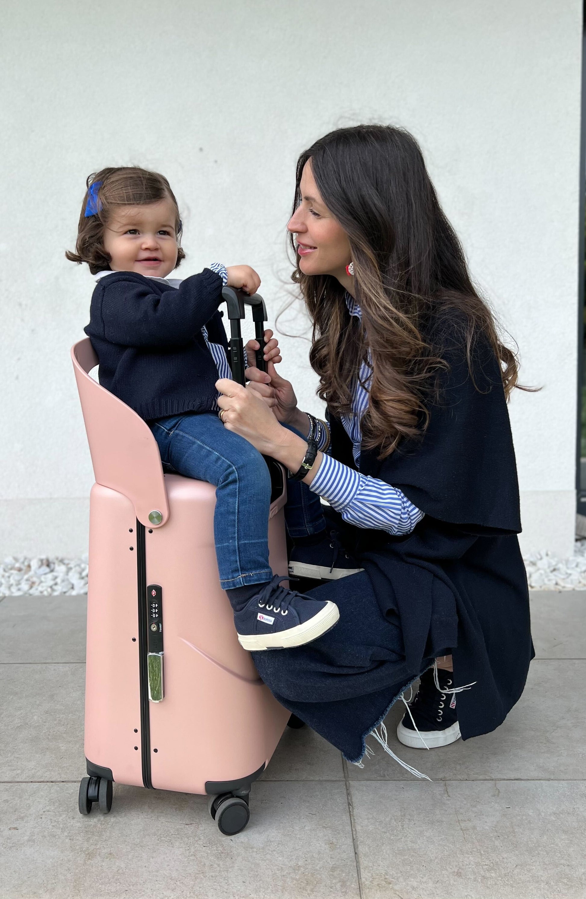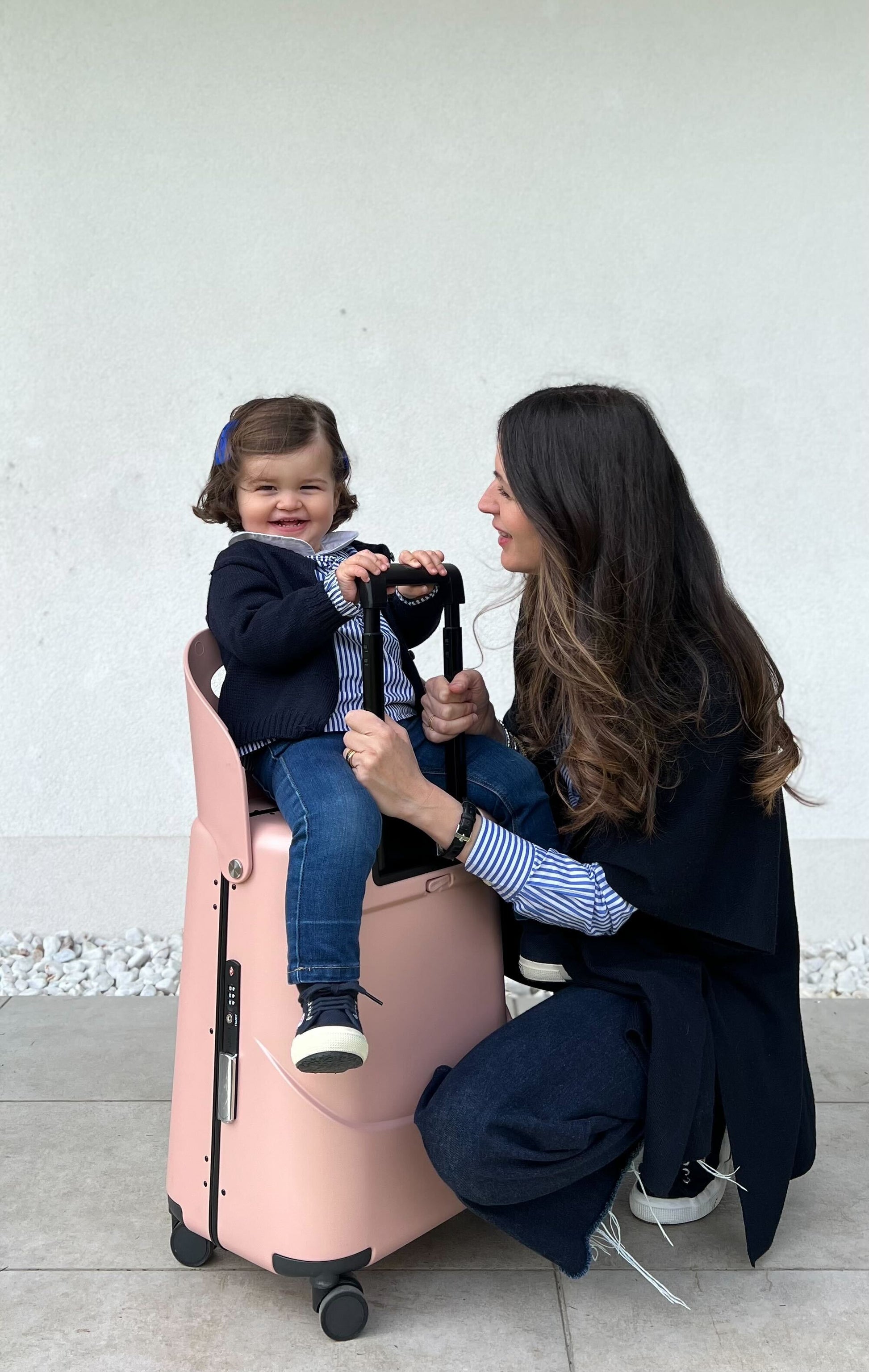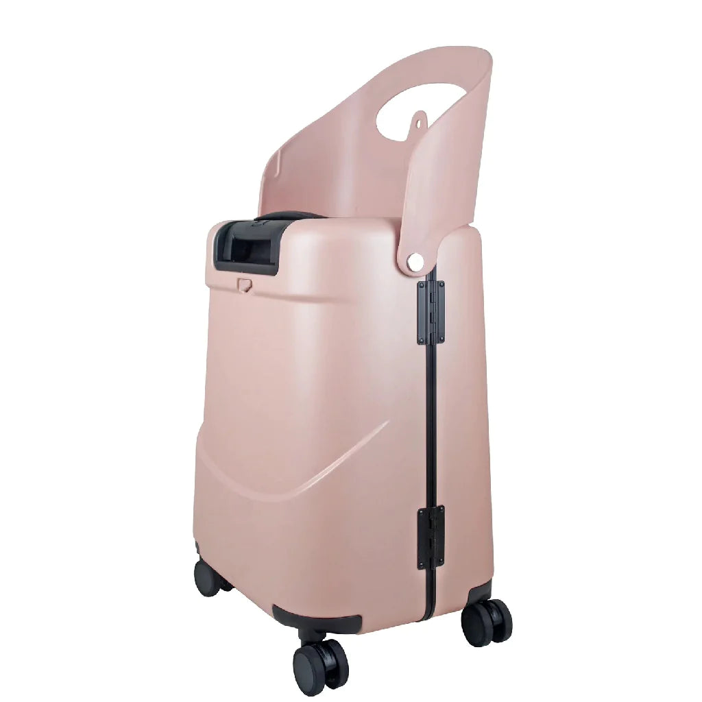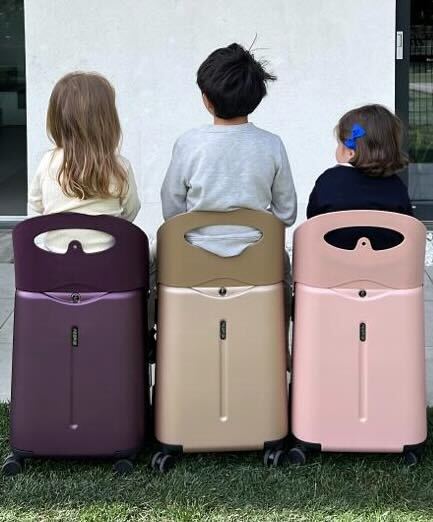 The MiaMily luggage bag is a versatile companion that transforms into a ride-on suitcase for kids or a portable seat for adults, providing convenient travel and a resting place. Without a child, it securely stores essentials like a diaper bag, travel bag, or briefcase.