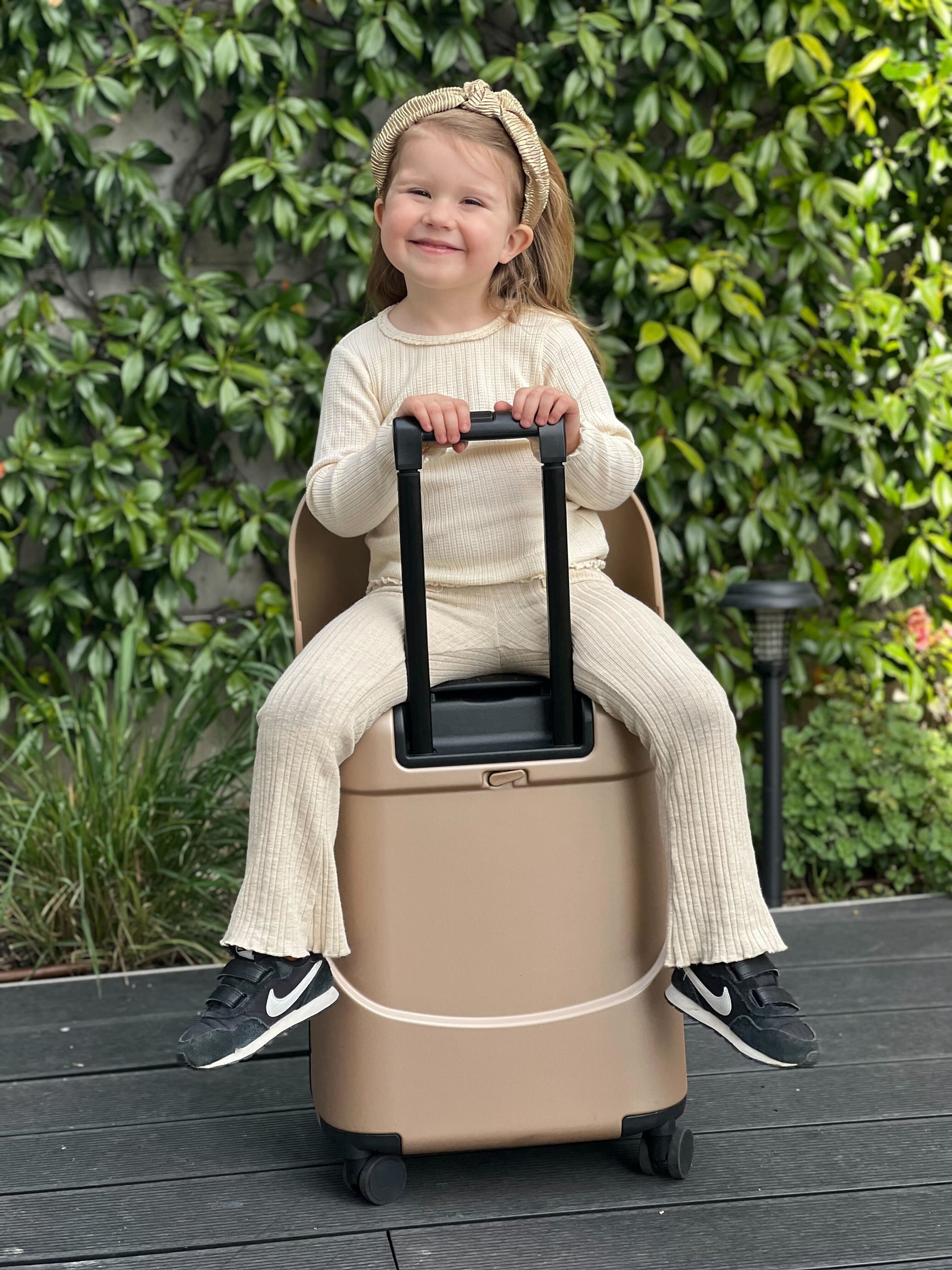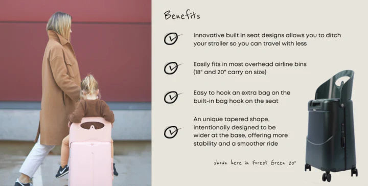 The MiaMily luggage bag is a versatile companion that transforms into a ride-on suitcase for kids or a portable seat for adults, providing convenient travel and a resting place. Without a child, it securely stores essentials like a diaper bag, travel bag, or briefcase.