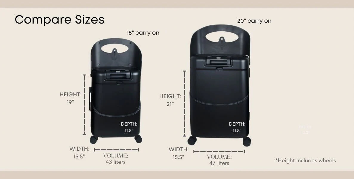 Can I bring this on a plane?Carry on 18" and 20" are both carry on size, and can fit in most airlines' overhead compartment but please check your airline as every airline has different requirements.
