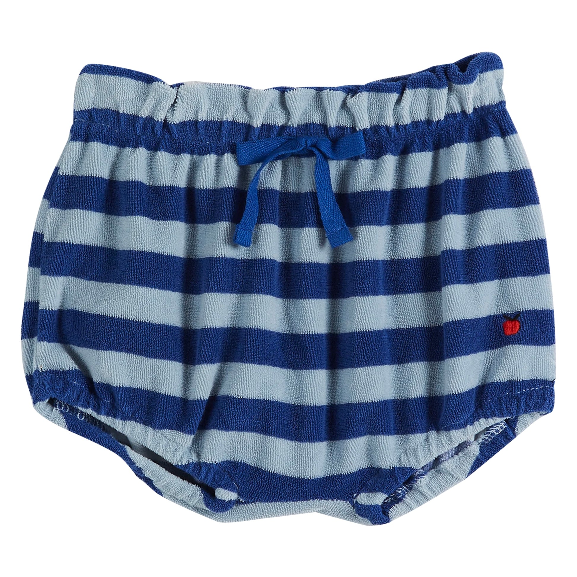 Bloomer in terry cloth with wide light and dark blue stripes. We love the soft, plush and comfortable blend of cotton and polyester. The polyester, added to the cotton in very small quantities, gives the fabric exceptional elasticity and prevents wrinkling. A little bloomer with elasticated thighs and a cotton twill bow at the waistband. Paired with a tee-shirt or a little blouse, your babies will be the cutest on the town, in the country or on the beach. The game: find the little apple embroidered on the side.