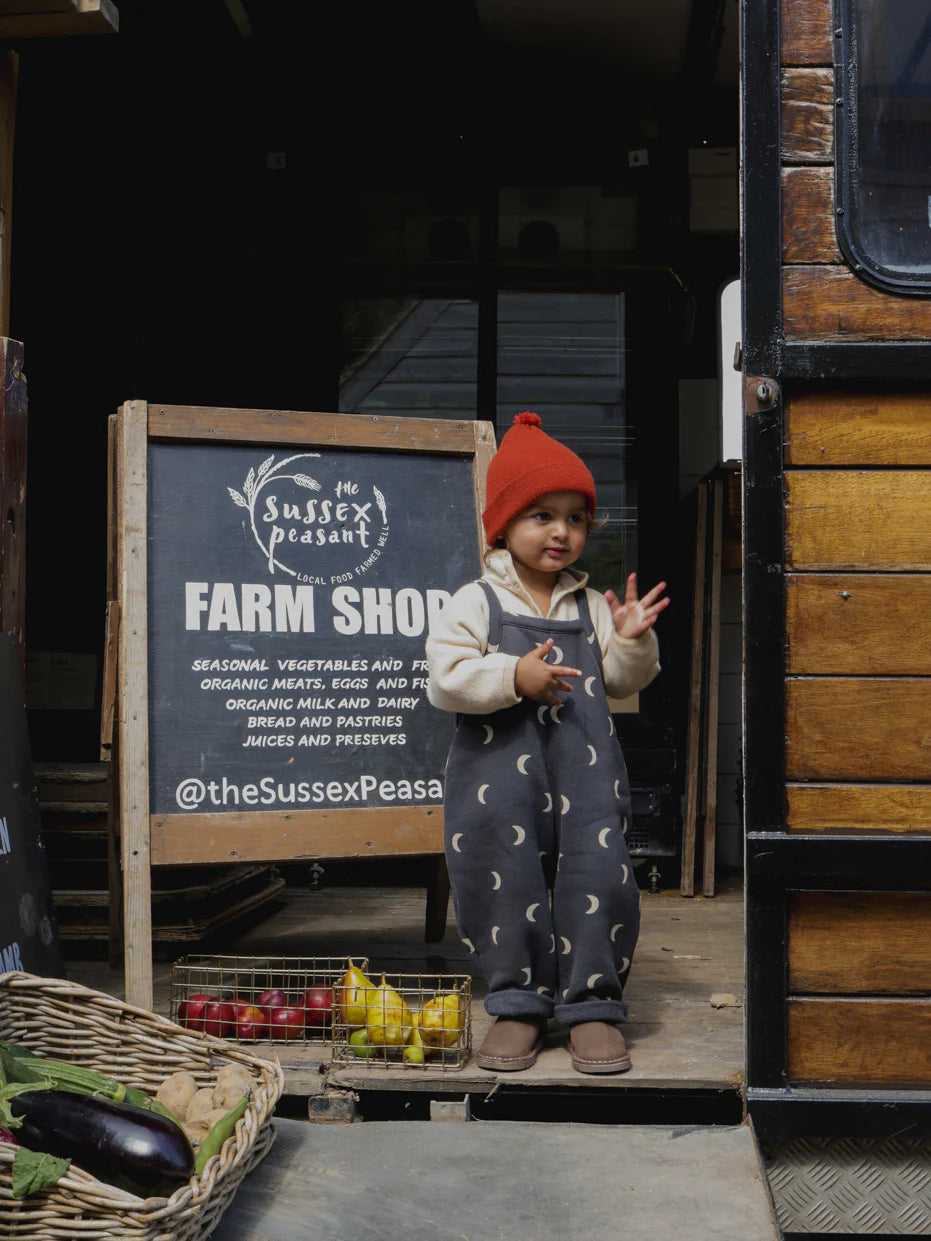 Our classic Midnight Dungarees have been updated with a new colour way and are the ultimate wardrobe essentials. Made of super-soft terry cotton, they will keep your little one comfortable all day long.