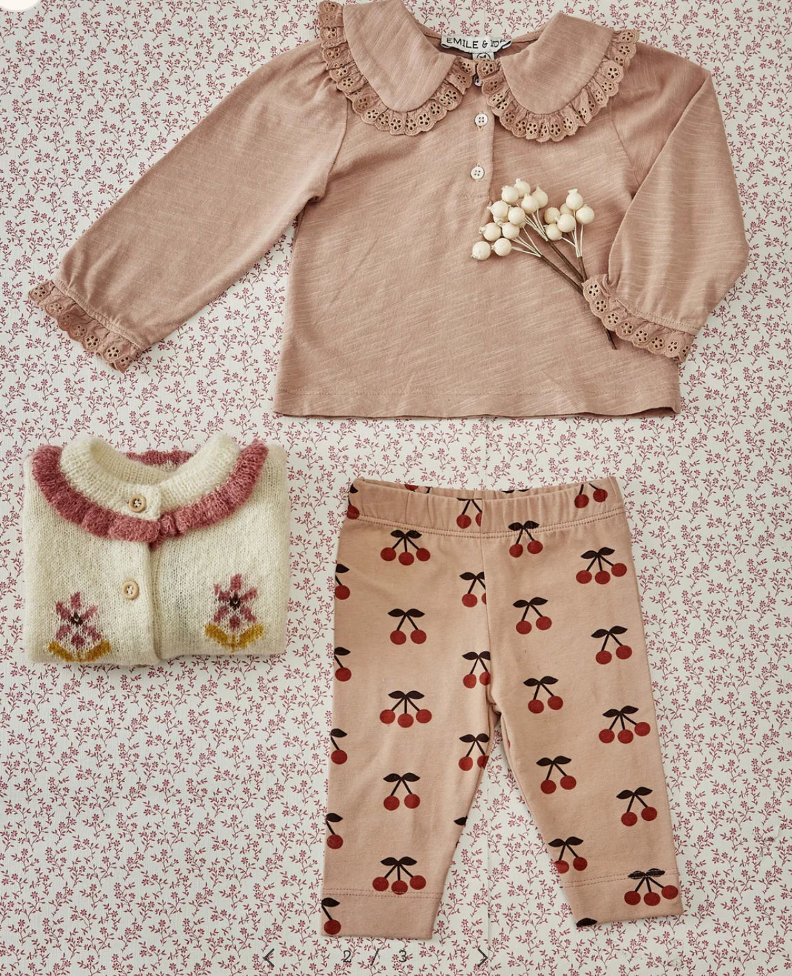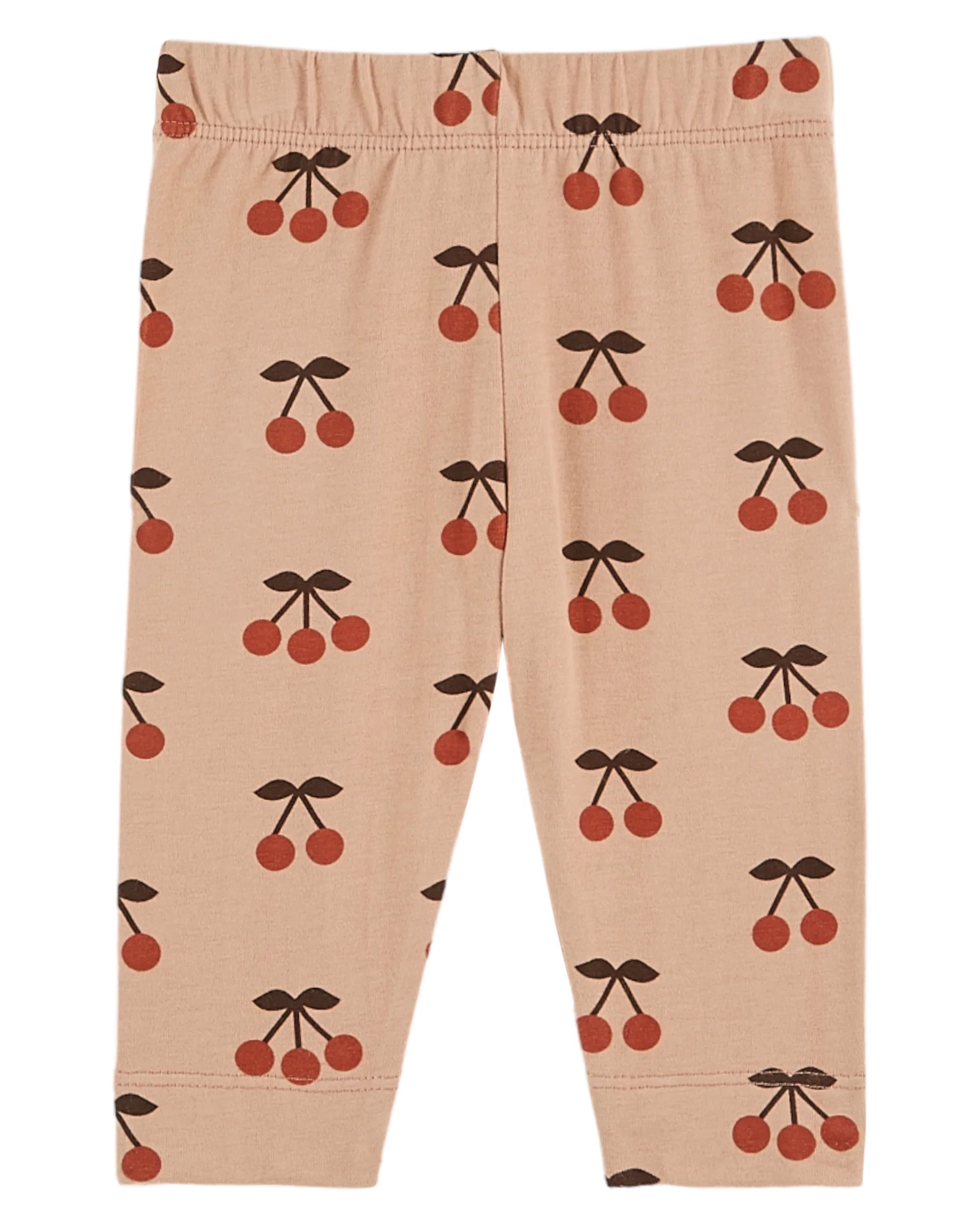 Powder pink leggings in organic cotton jersey with cherry pattern. They can be worn as pants with a tee shirt, blouse and sweatshirt or woollen garment as soon as the days get cooler, but can also be transformed into tights with a skirt or dress when the days get colder. The fabric is as soft as a baby's skin. With its elasticated waistband and soft organic fabric, these leggings are an original basic that complements any outfit.