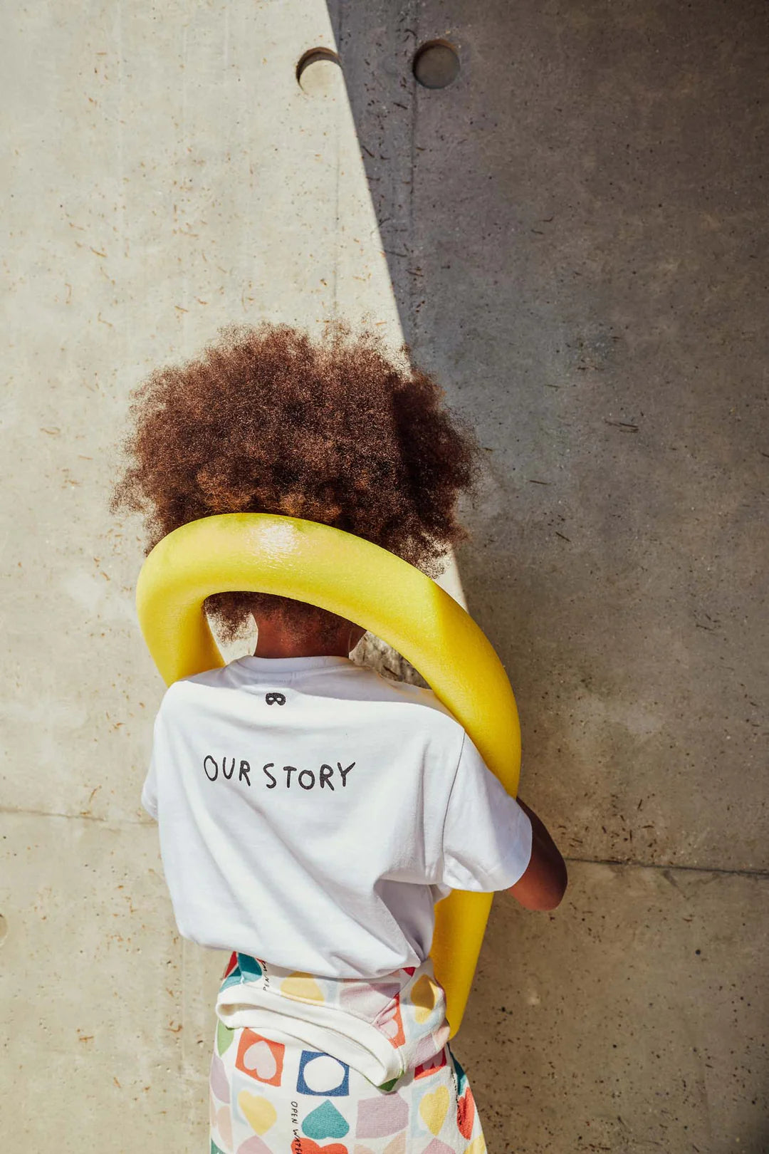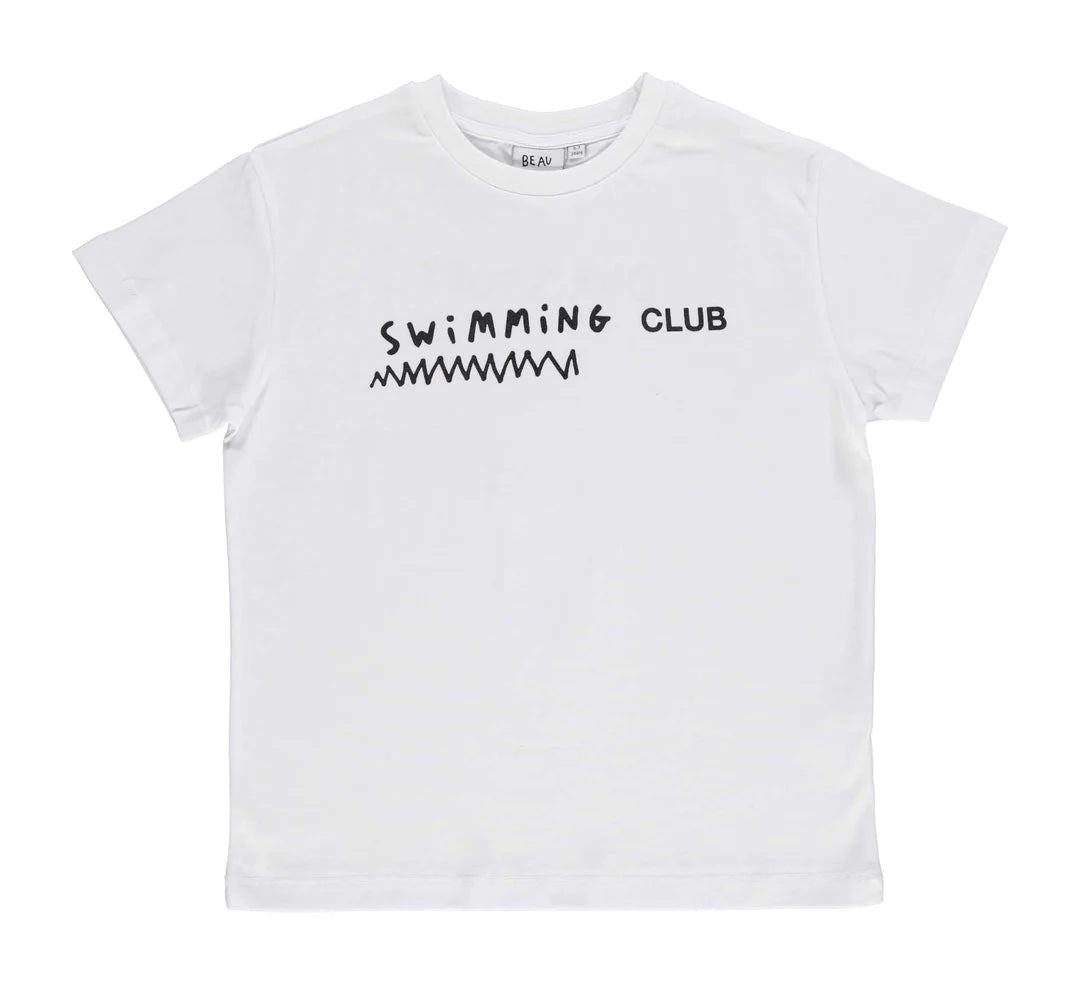 A classic white t-shirt with 'Swimming Club' on the front and 'Our Story' printed on the back. This t-shirt is designed in a classic fit and features a ribbed collar and short sleeves. Our signature embroidered superhero mask is at the nape of the neck.