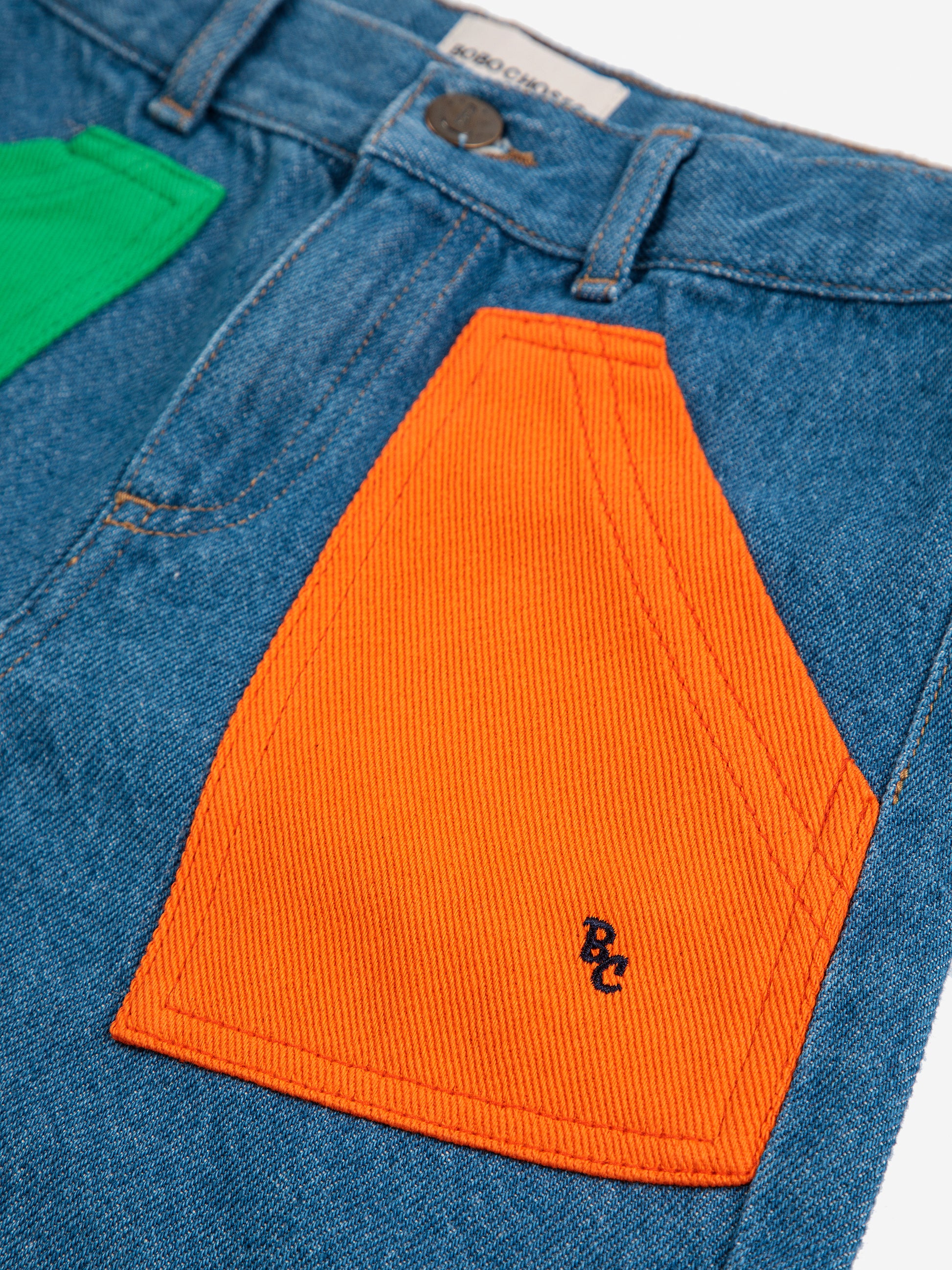 76% cotton,24% recycled cotton prussian blue shorts. Designed with regular crotch, adjustable waistband, front button fastening, zipped, embroidery, straight fit, regular, back yoke, beltloop, over knee length, patch pocket and denim
