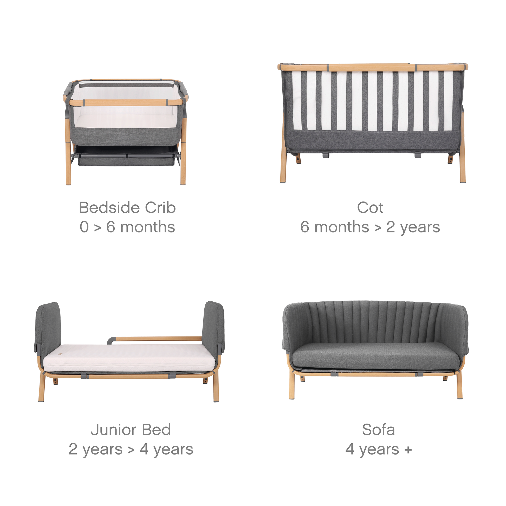 The CoZee XL junior bed and sofa expansion pack in oak and charcoal offers the functionality to convert the previous cot mode into a toddler bed that can be used up until the age of four, and ultimately into a sofa, which makes for a fun addition to your child's bedroom.