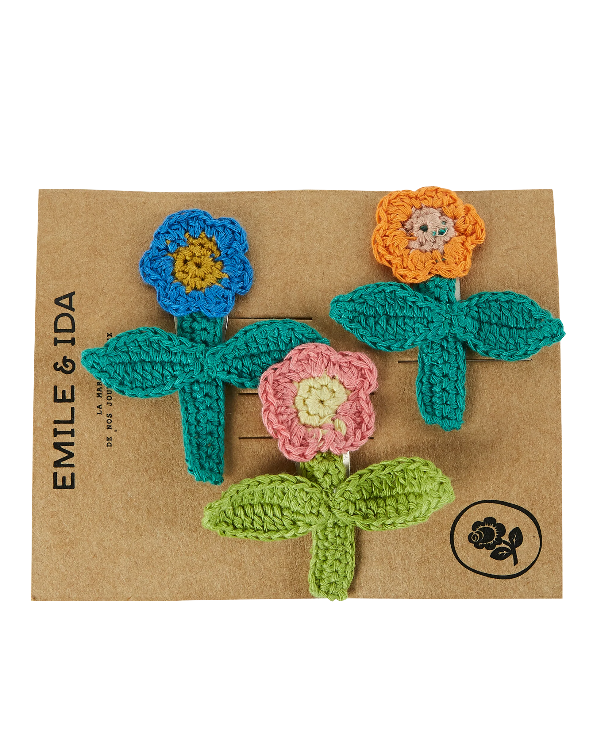 Hand-crocheted cotton flower clips. Clip them into your hair or to the lapel of a jacket for a springtime look... They'll keep that rebellious streak in check until you've exchanged them for a piece of candy in the playground! They can also be given as birthday presents to girlfriends who dream of them.