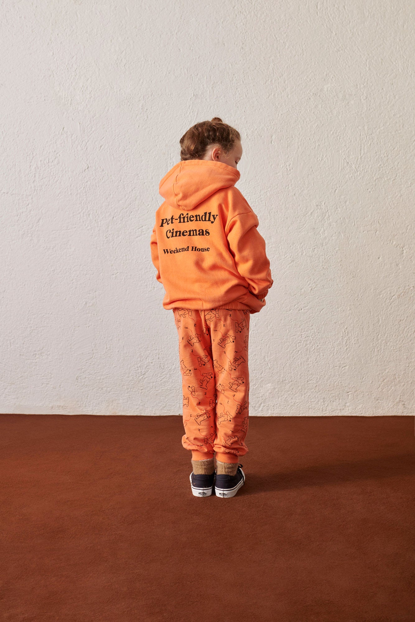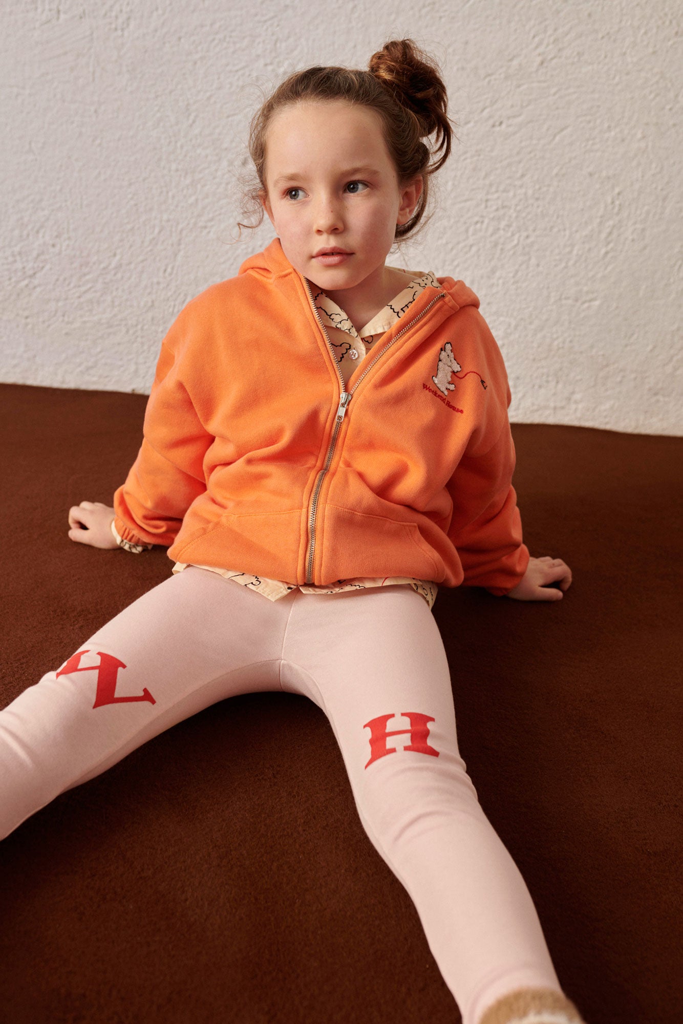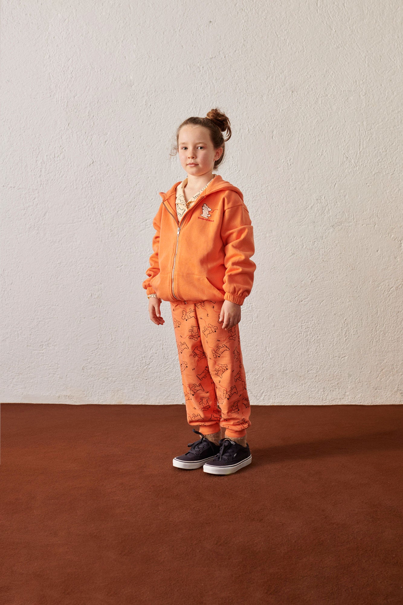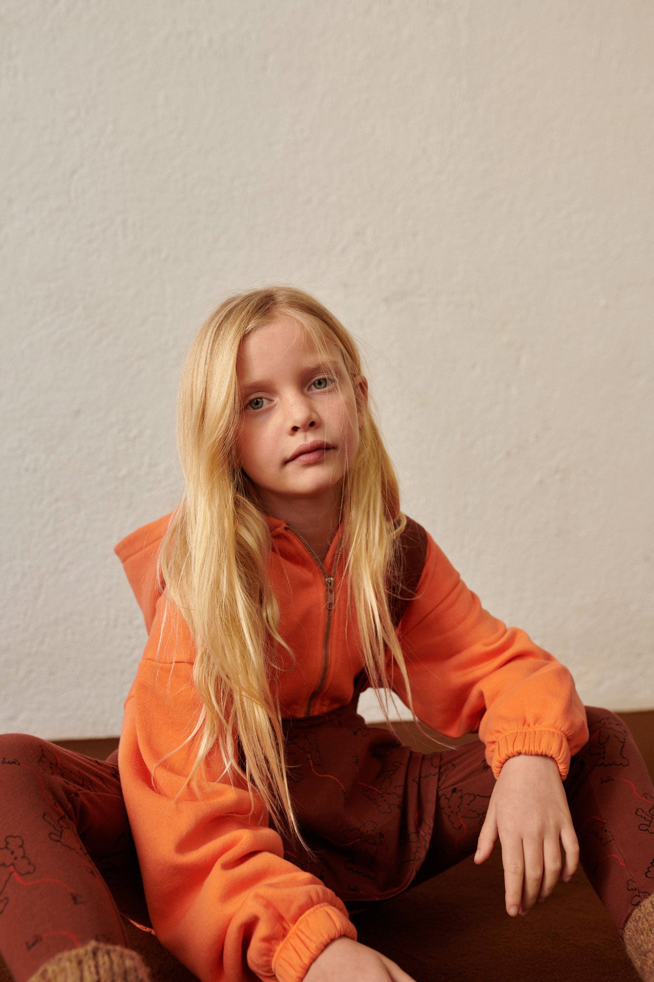 Oversized 100% organic cotton hoodie, orange garment dyed, with zipper and pockets on both sides, and an embroidery on the front and a print on the back.