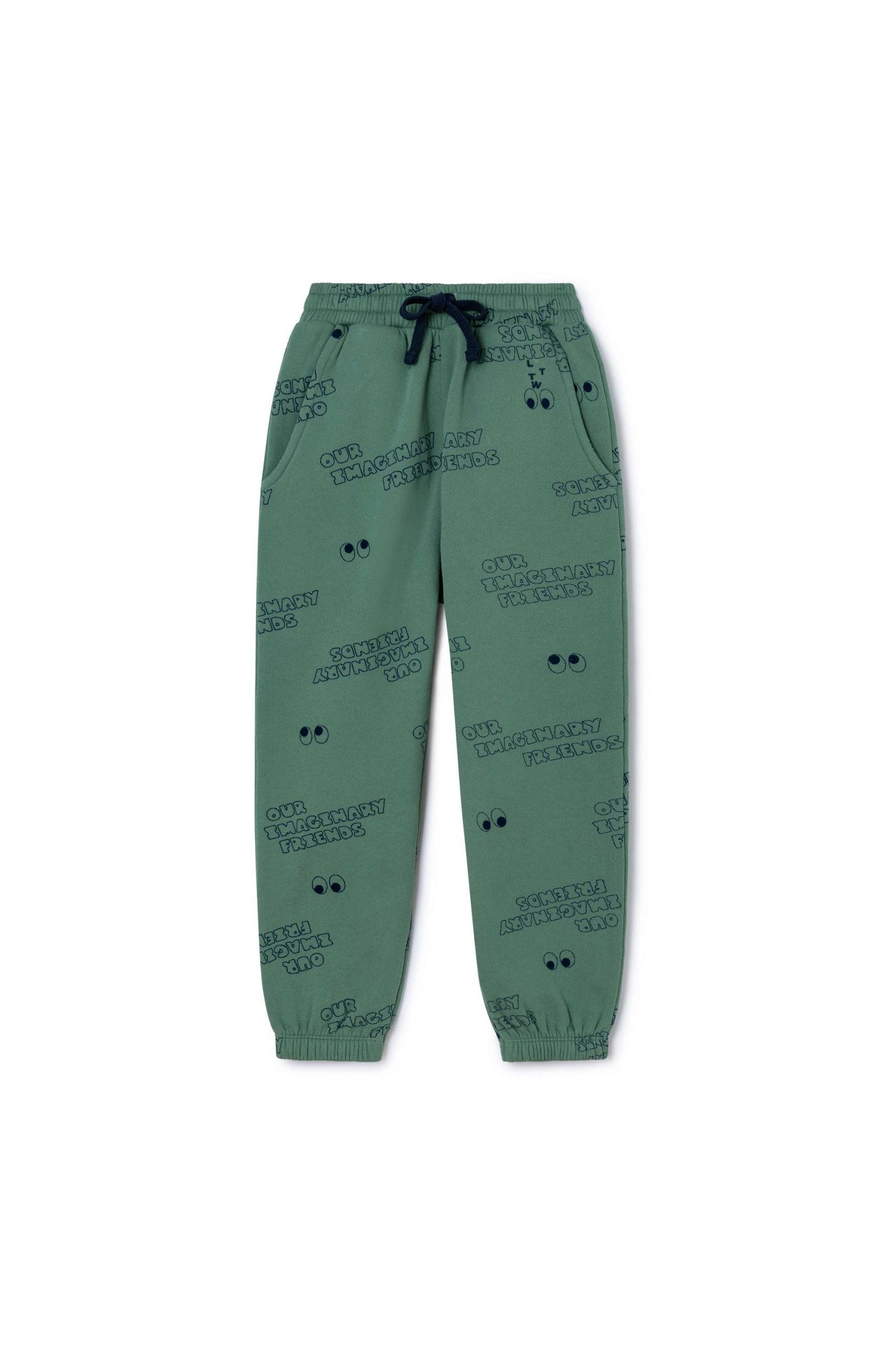100 % organic cotton texture fleece joggers in moss color. Elastic waistband with adjustable cord waistband and ribbed cuffs. All-over ”our imaginary friend” print. Overall oversized fit.