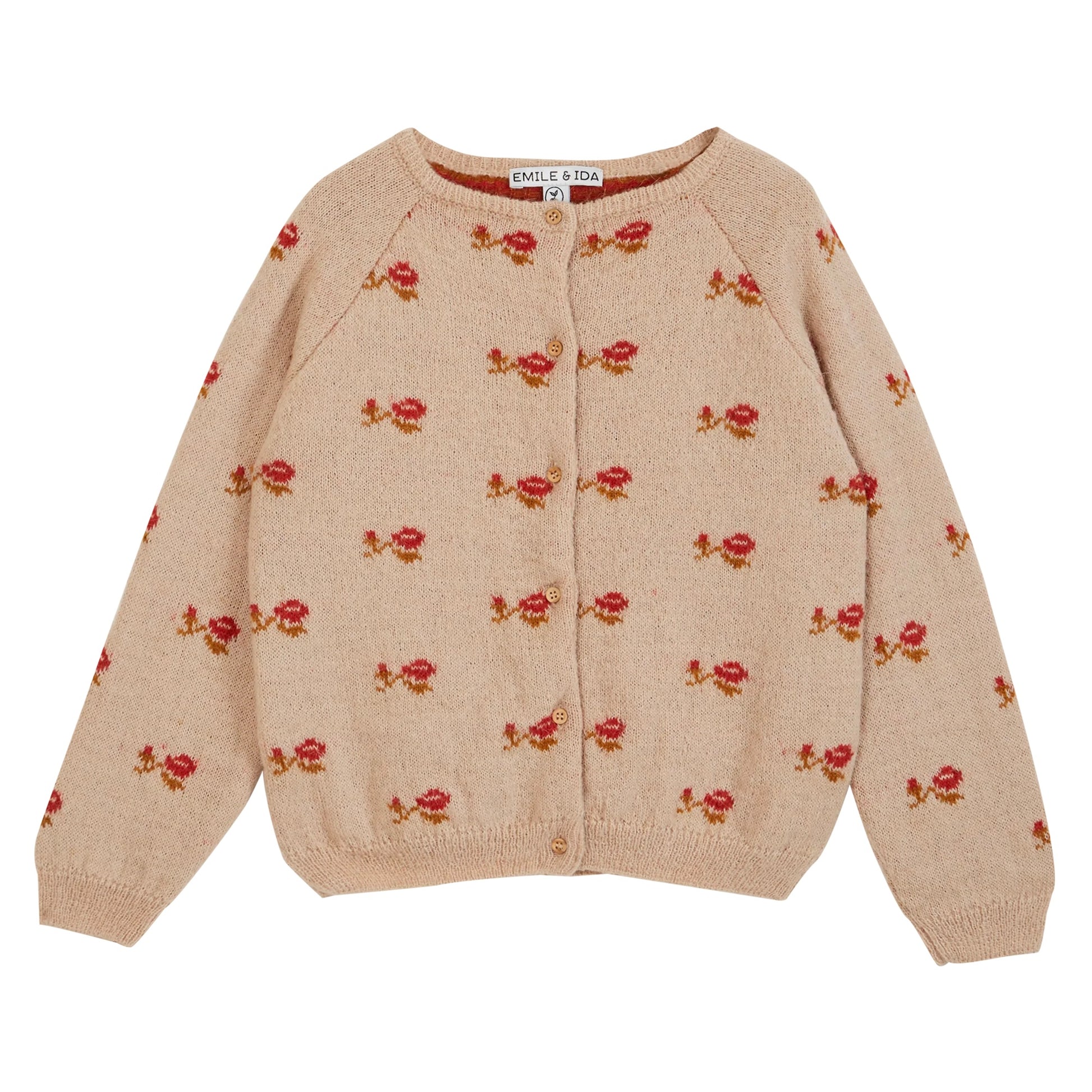 Jacquard cardigan in alpaca wool and synthetic fibers in beige and pink all over. Thus, this cozy, light cardigan will not deform or wrinkle thanks to the contribution of synthetic fibers and as a bonus, it will resist the assaults of the playground. The intarsia jacquard, a knitting technique used to design the roses and their stems, makes the sweater twice as warm and twice as soft. Thanks to the 1X1 ribbing at the cuffs, hem, and around the crew neckline, the cold doesn't get into the wide raglan sleeves, nor does it get close to the body.