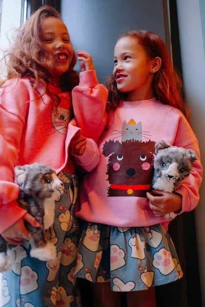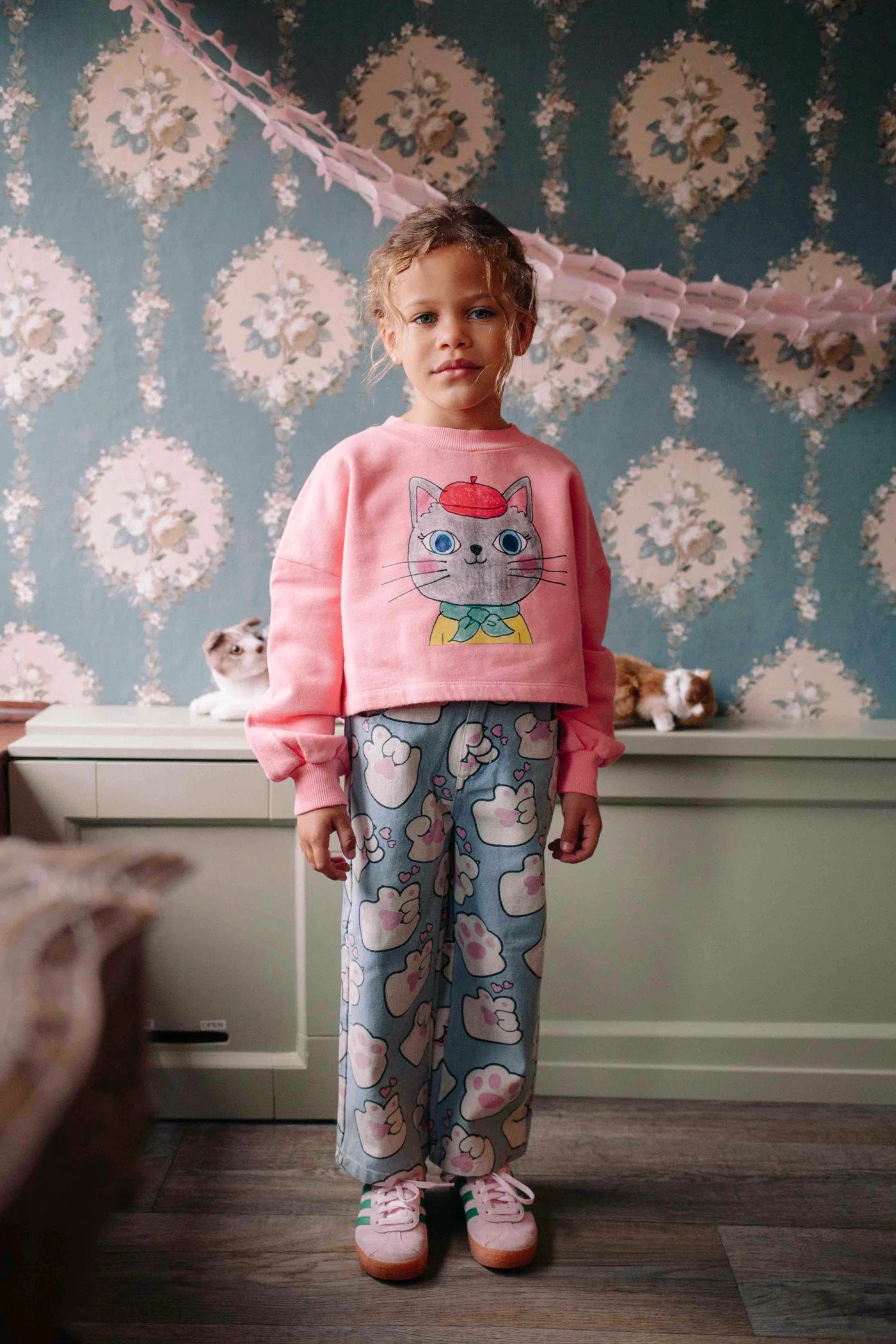 These light blue jeans feature an all-over print of cute cat paws with little pink hearts and a design full of fun and character. Cut in a straight-leg fit with classic five-pocket styling, they combine everyday comfort with a bold, whimsical twist.