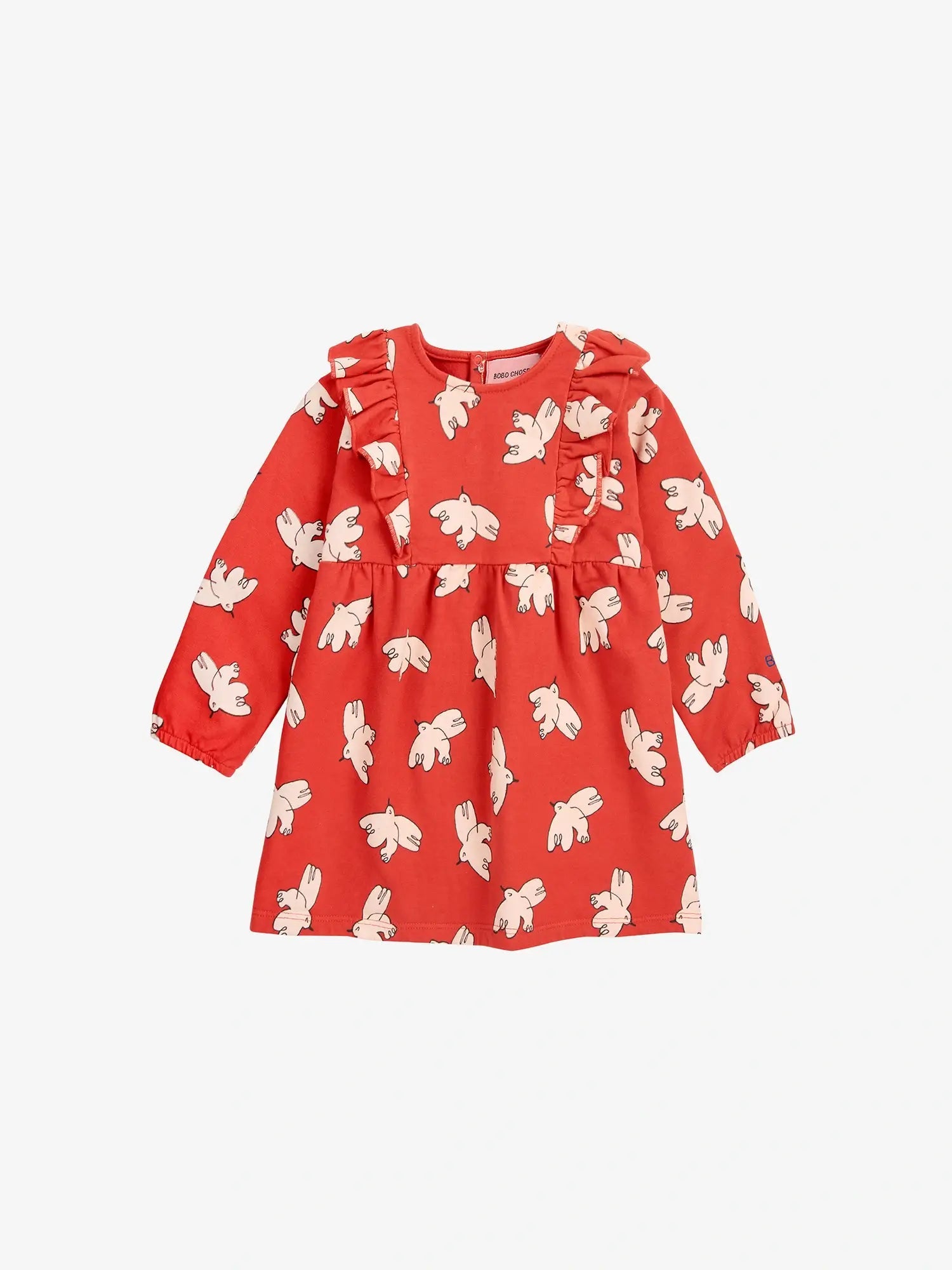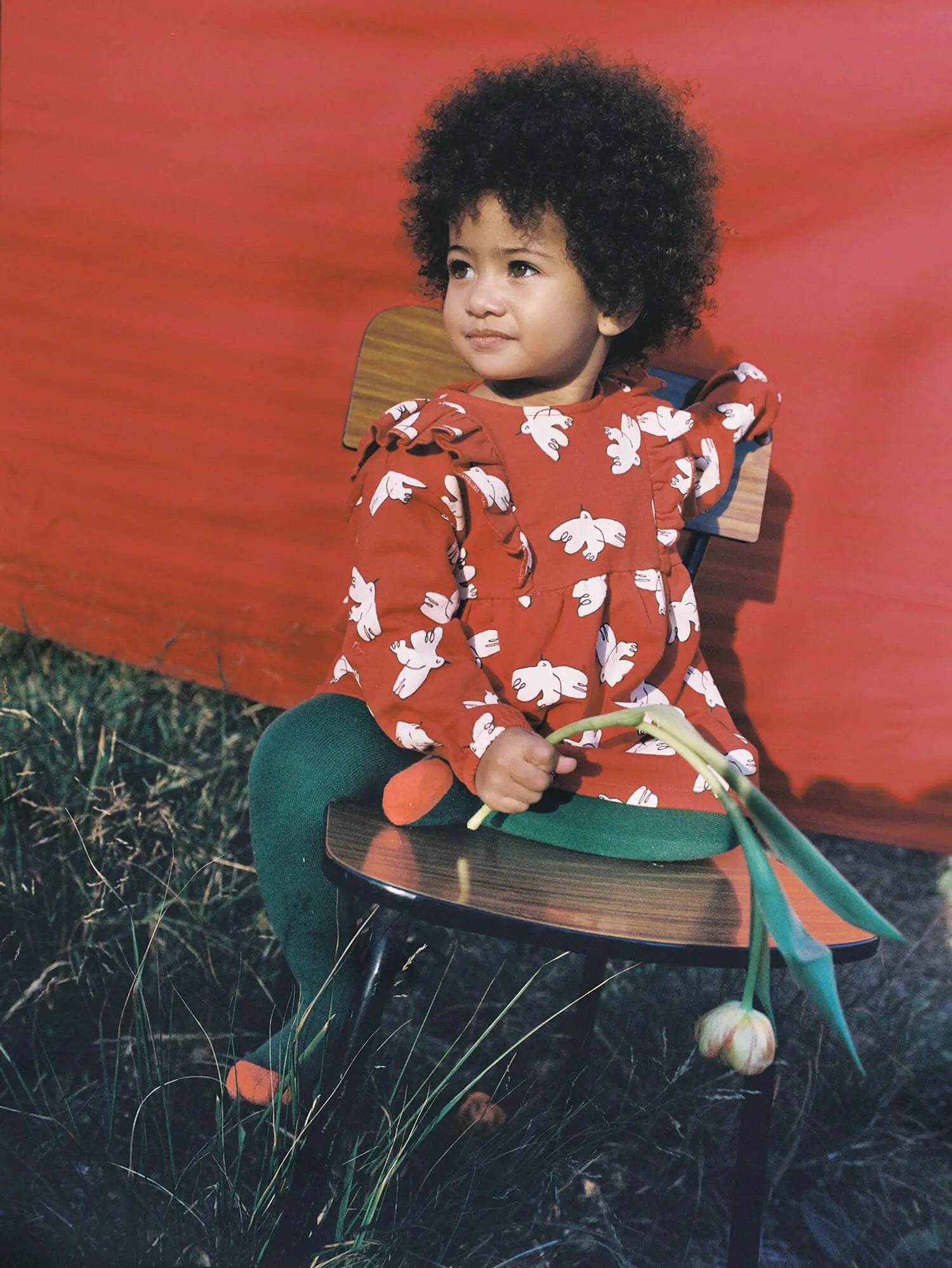 Inspired by the fairy tale universes that shaped our own childhood, our red "Freedom Bird" dress beckons adventure. Its playful print of white birds sparks creativity in the little ones, inspiring them to weave new stories and boldly explore. Let their imaginations soar as they explore the magic world around them.