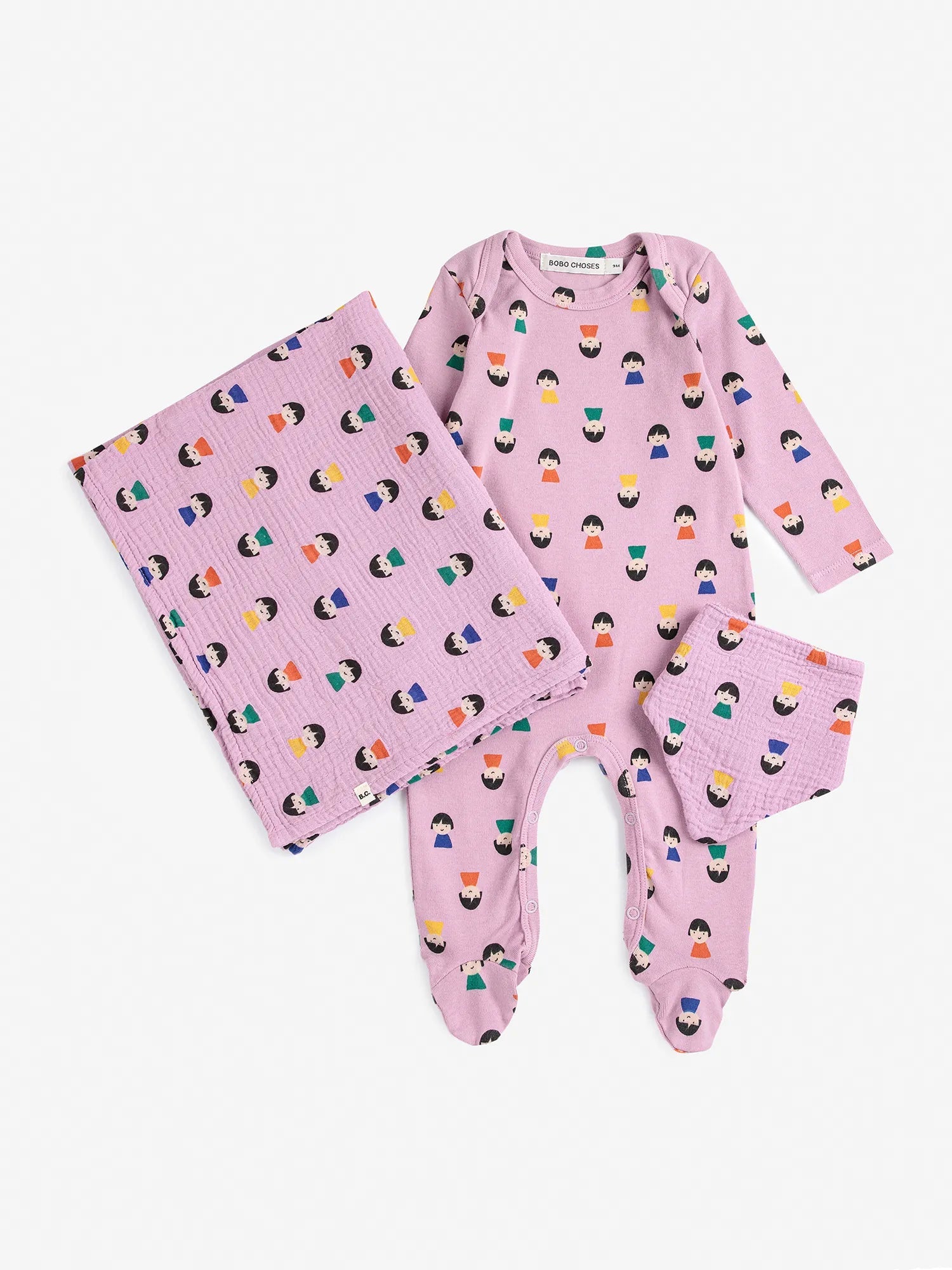 Light blue baby gift pack. Designed with long sleeves, crotch snap fastening, slim fit, long length and envelope neck. Made in Spain.