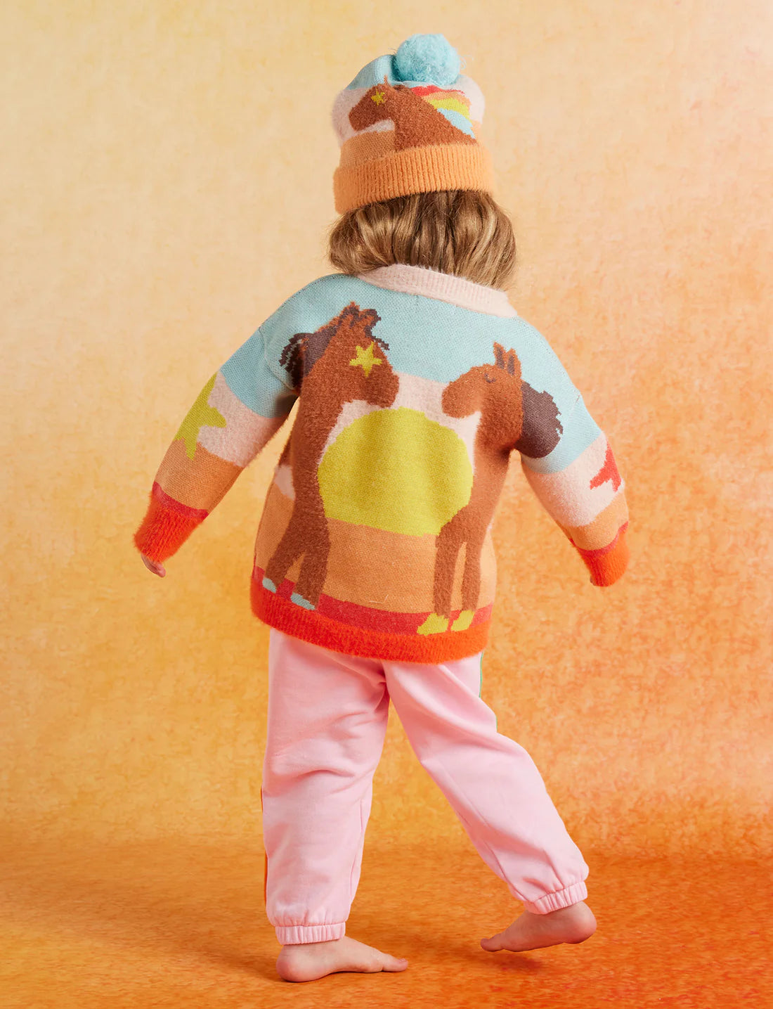 Features a central button opening, subtle fluffy finish and picture knit design from our Giddy Up collection on both sides.