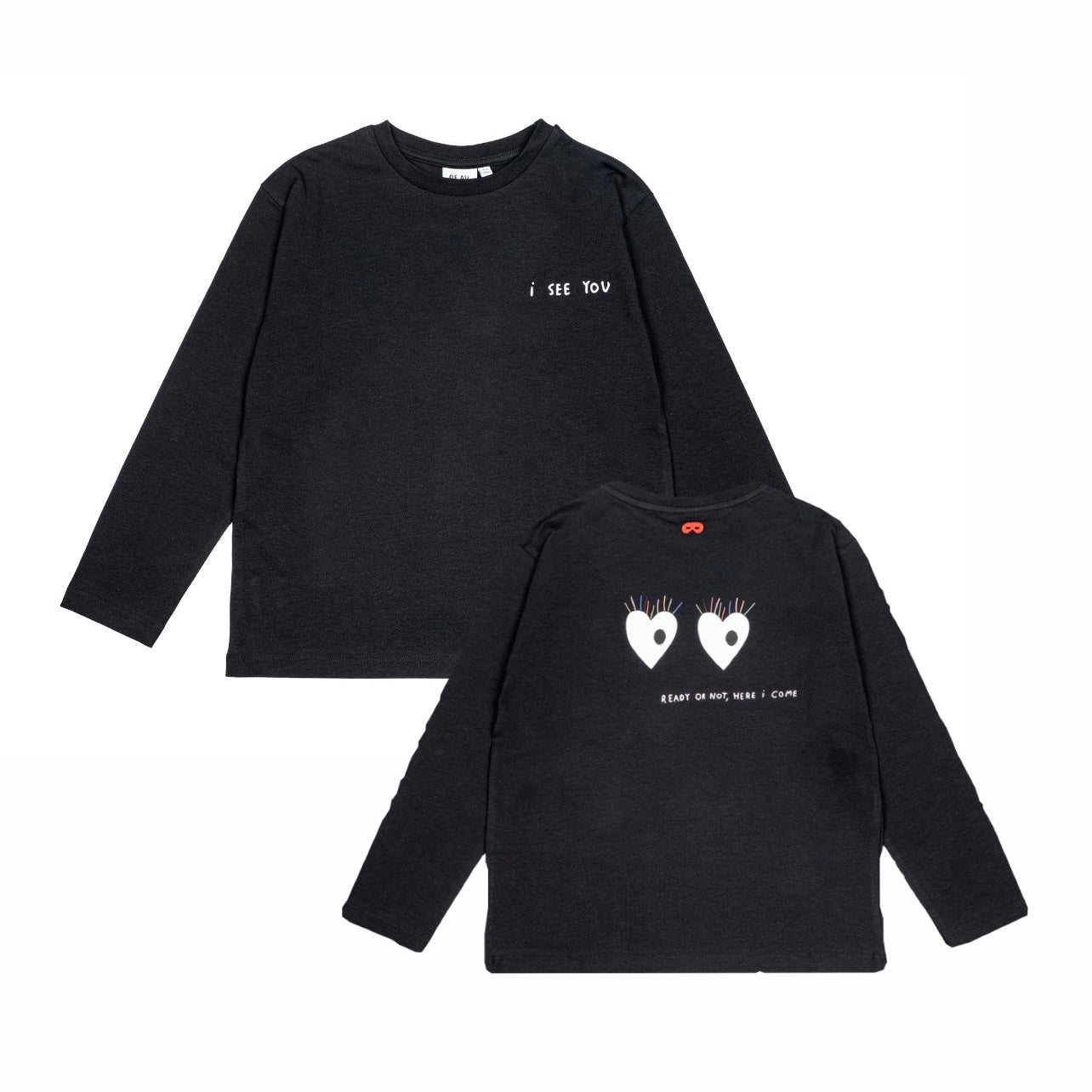 Made from organic cotton, this classic fit, long sleeve t-shirt features 'I See You' on the front, and heart eyes with 'Ready Or Not, Here I Come' on the back. It also features our signature hero mask at the nape of the neck. Easy to wear and easy to care for.