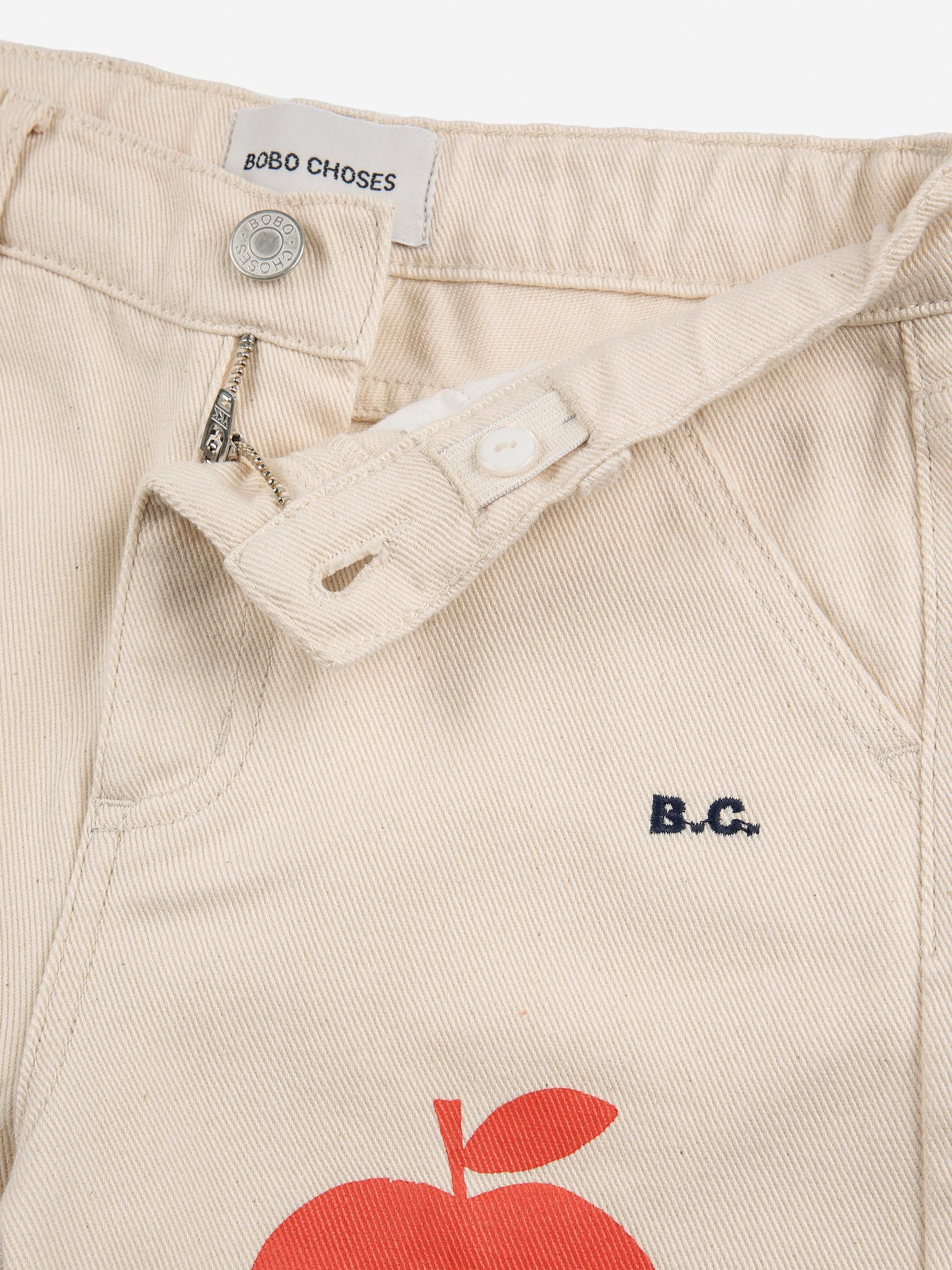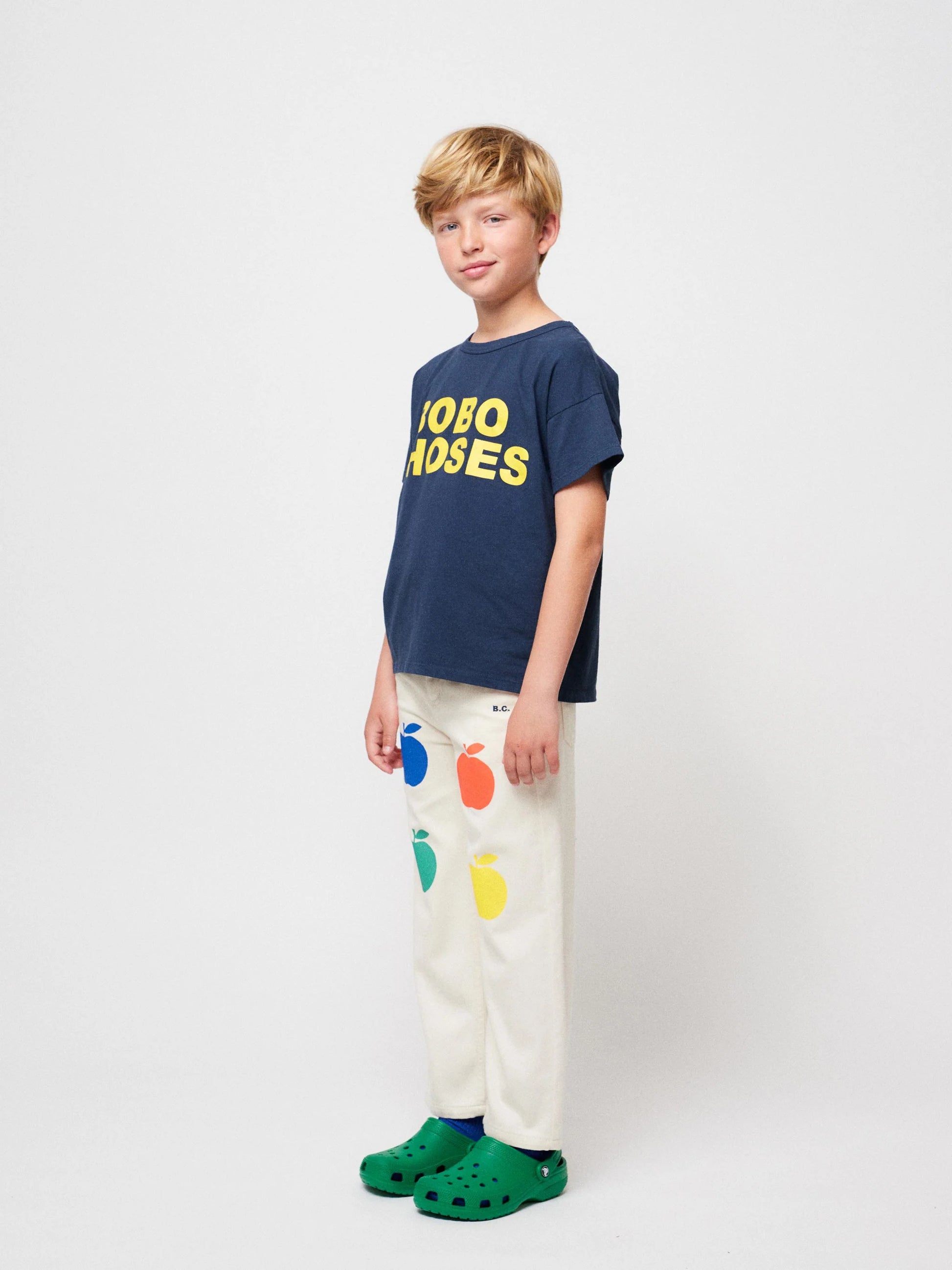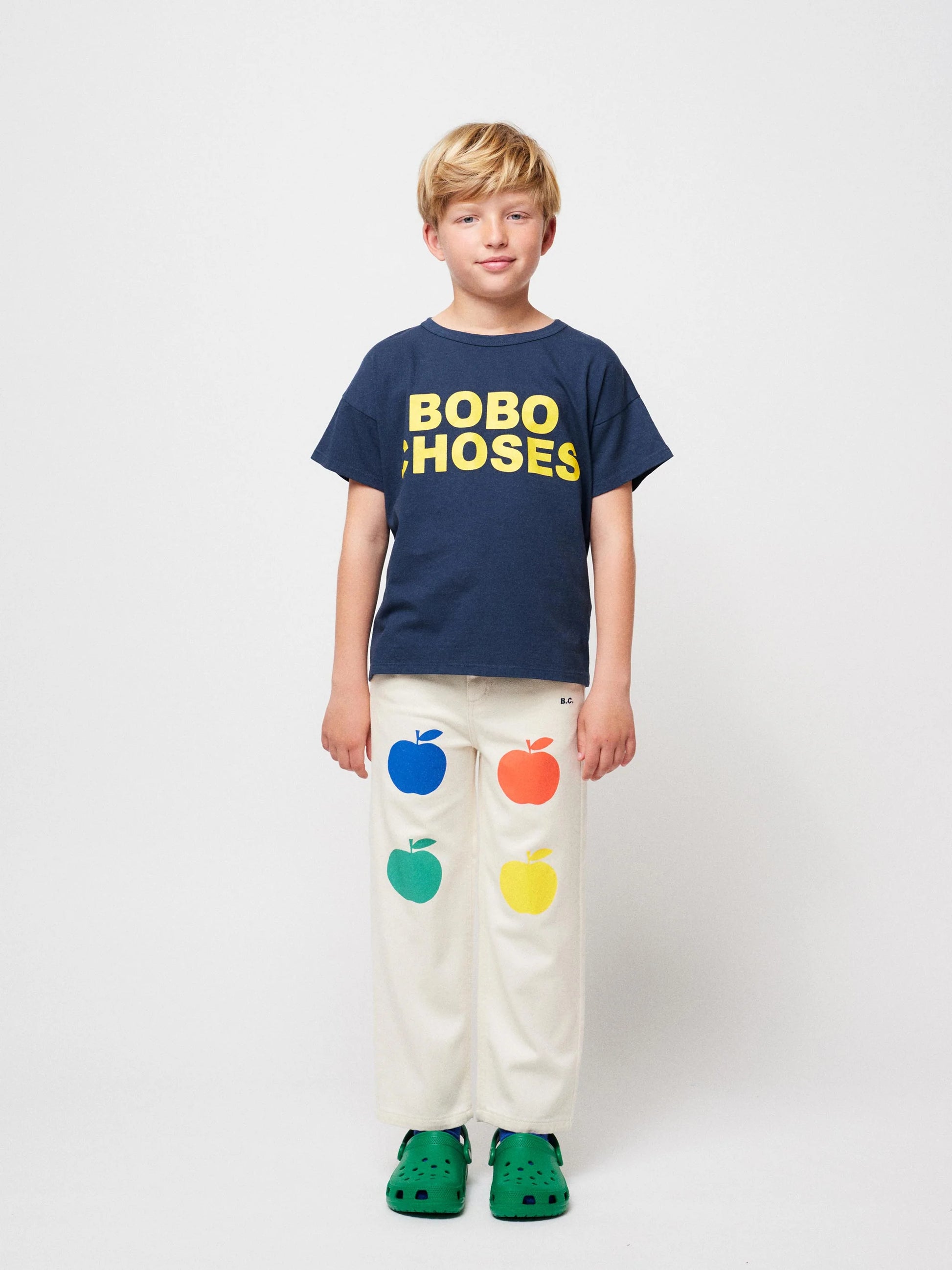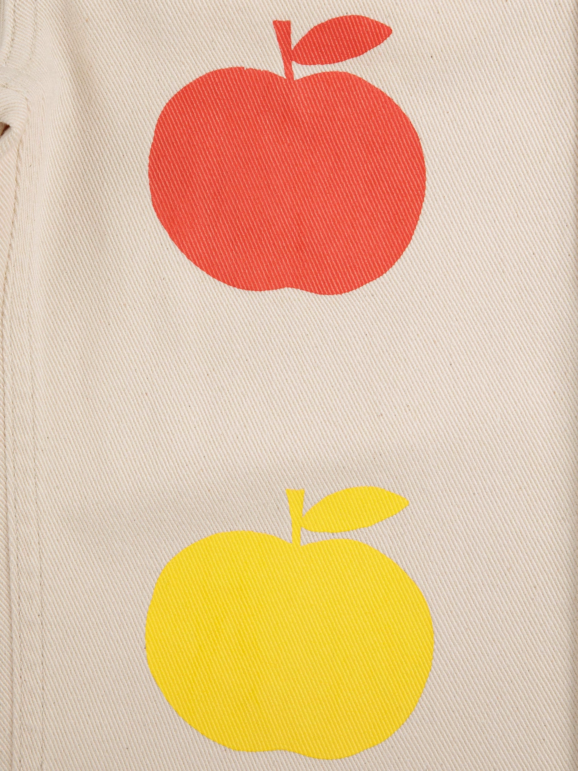 Dress your little ones in an effortless style with freedom of movement. Our "Poma" denim jeans in off-white feature four of our iconic apples on the front of the garment, in red, midnight blue, yellow, and green. A fun detail that will undoubtedly add personality, inviting them to celebrate life with Bobo Choses.