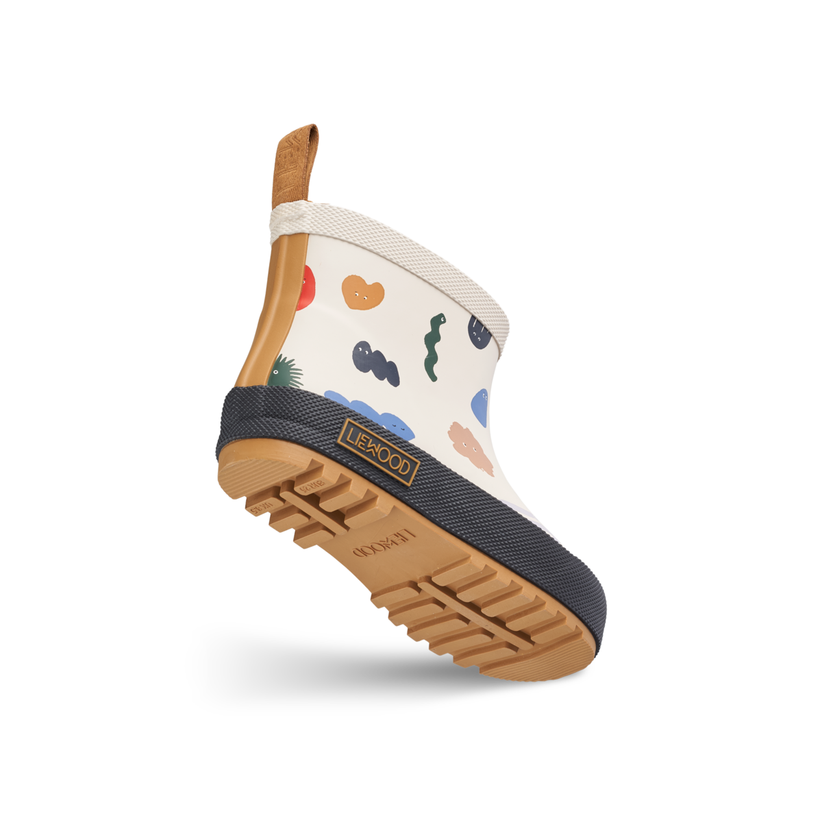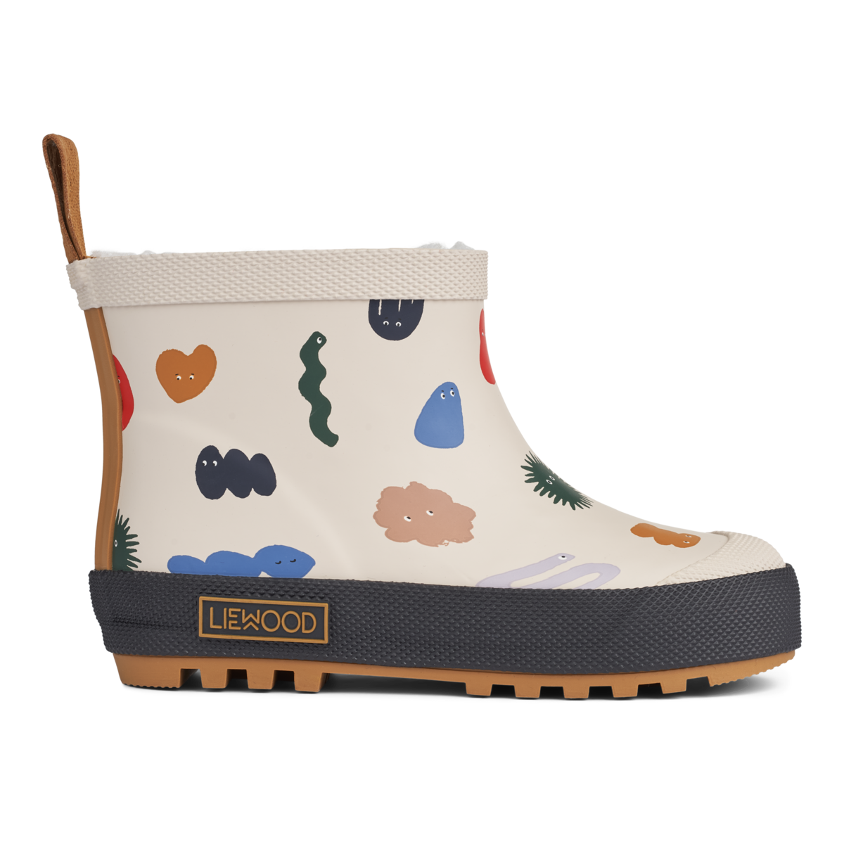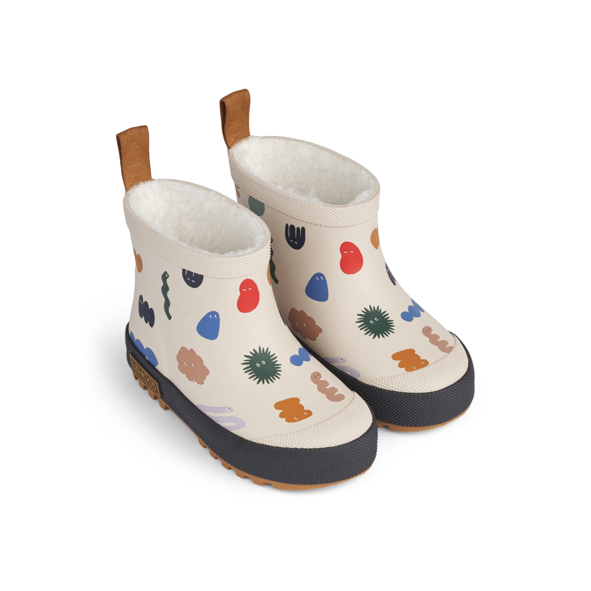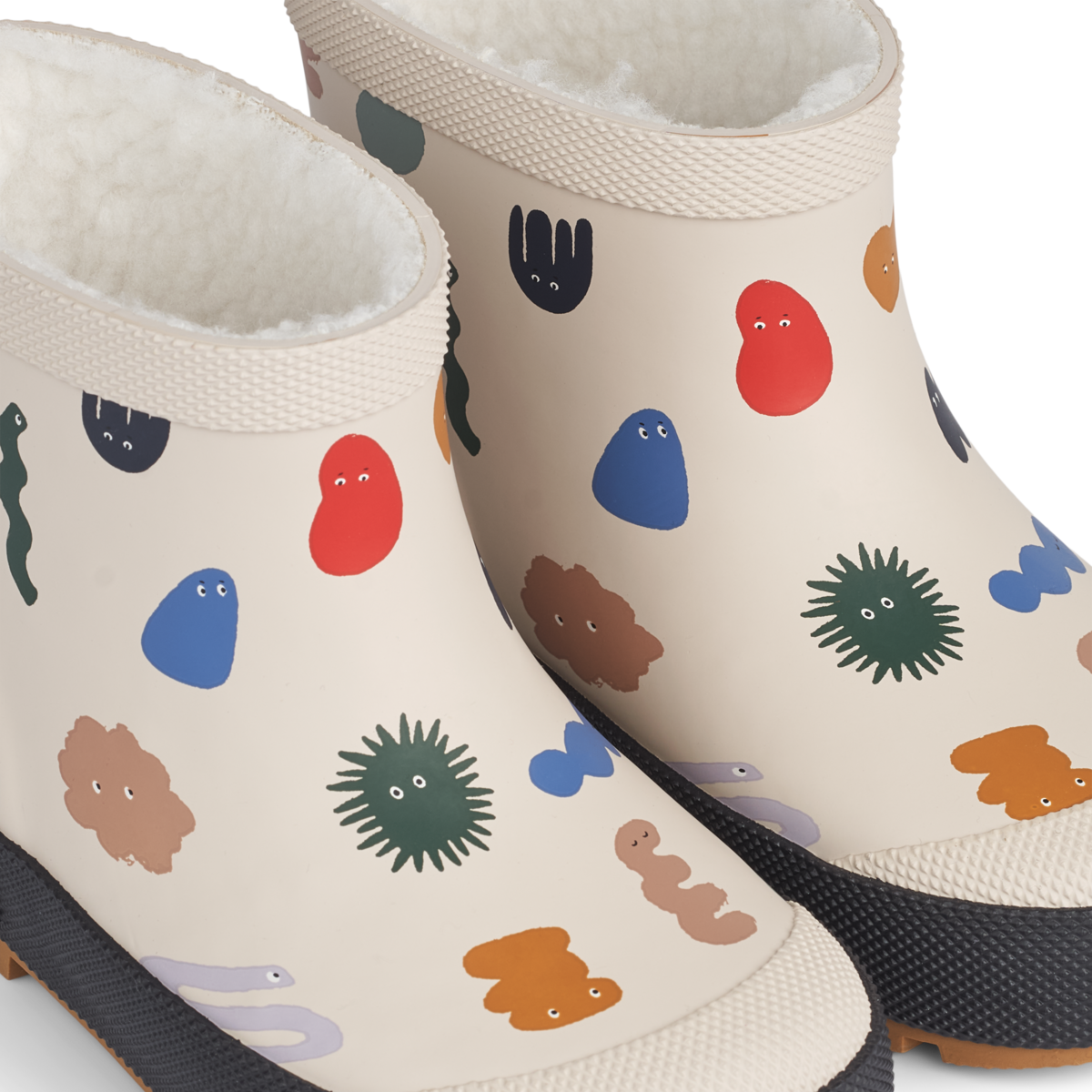 The short Jesse Thermo Rainboot has soft and warm teddy lining, making it slightly warmer than a regular rain boot. Designed to easy slip on and off and offers playful animal details.