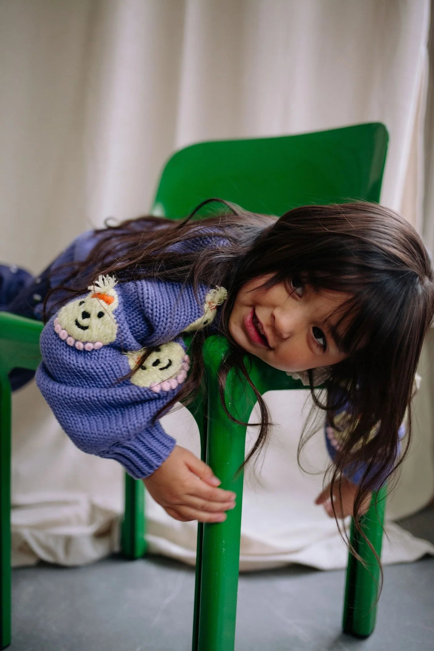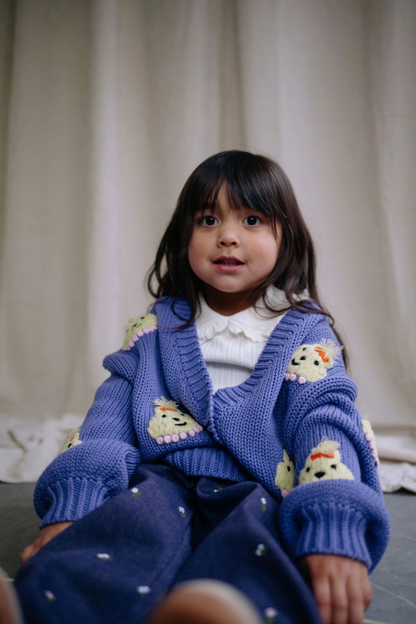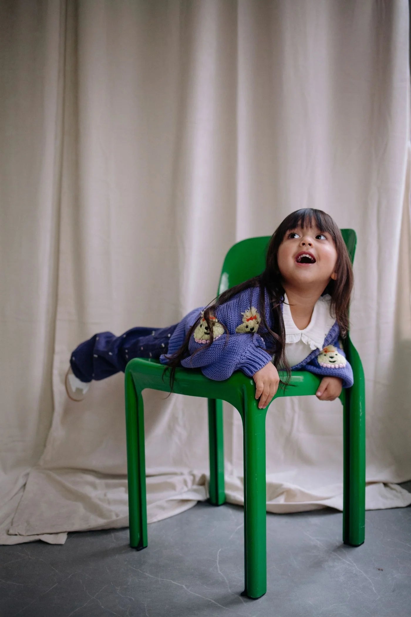 The Lady Arabella knitted cardigan is pure charm in cozy form. This cropped-fit cardigan comes in a rich soft purple hue, sprinkled with adorable lady face patches that add a playful touch. Balloon sleeves and a neat button closure complete its whimsical yet stylish look.