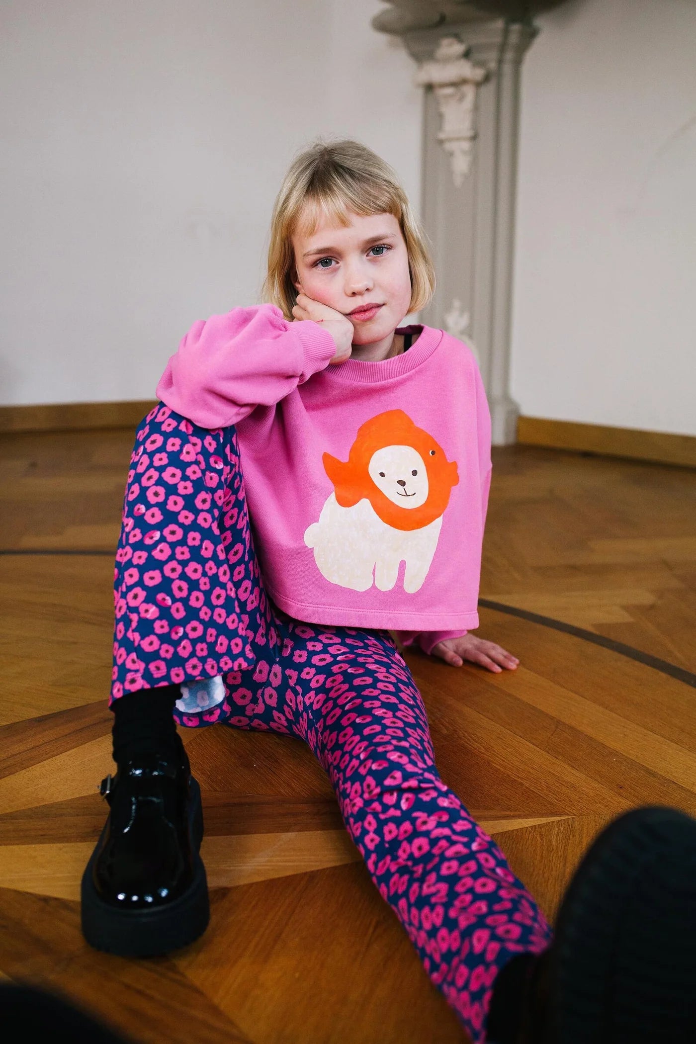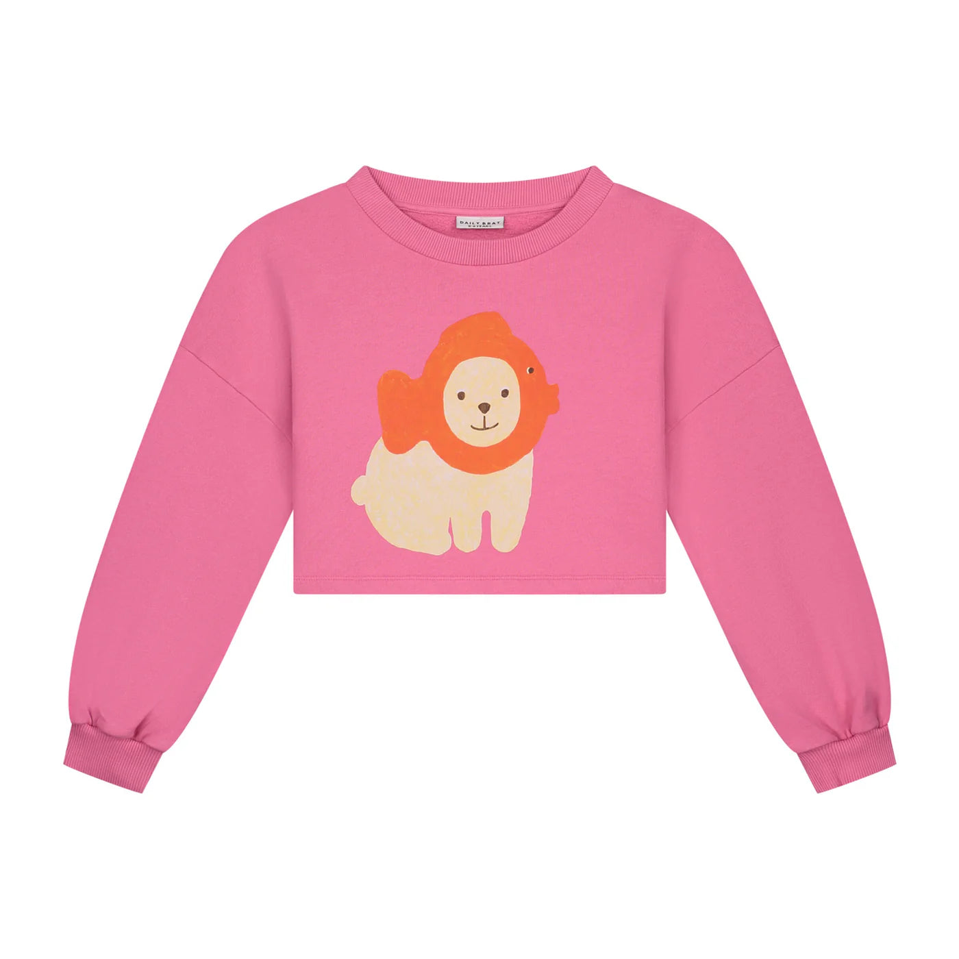 This cropped sweater is made from 100% organic cotton, Featuring the blazzy fish print, finished with ribbed trimming and designed in a cheerful pink.