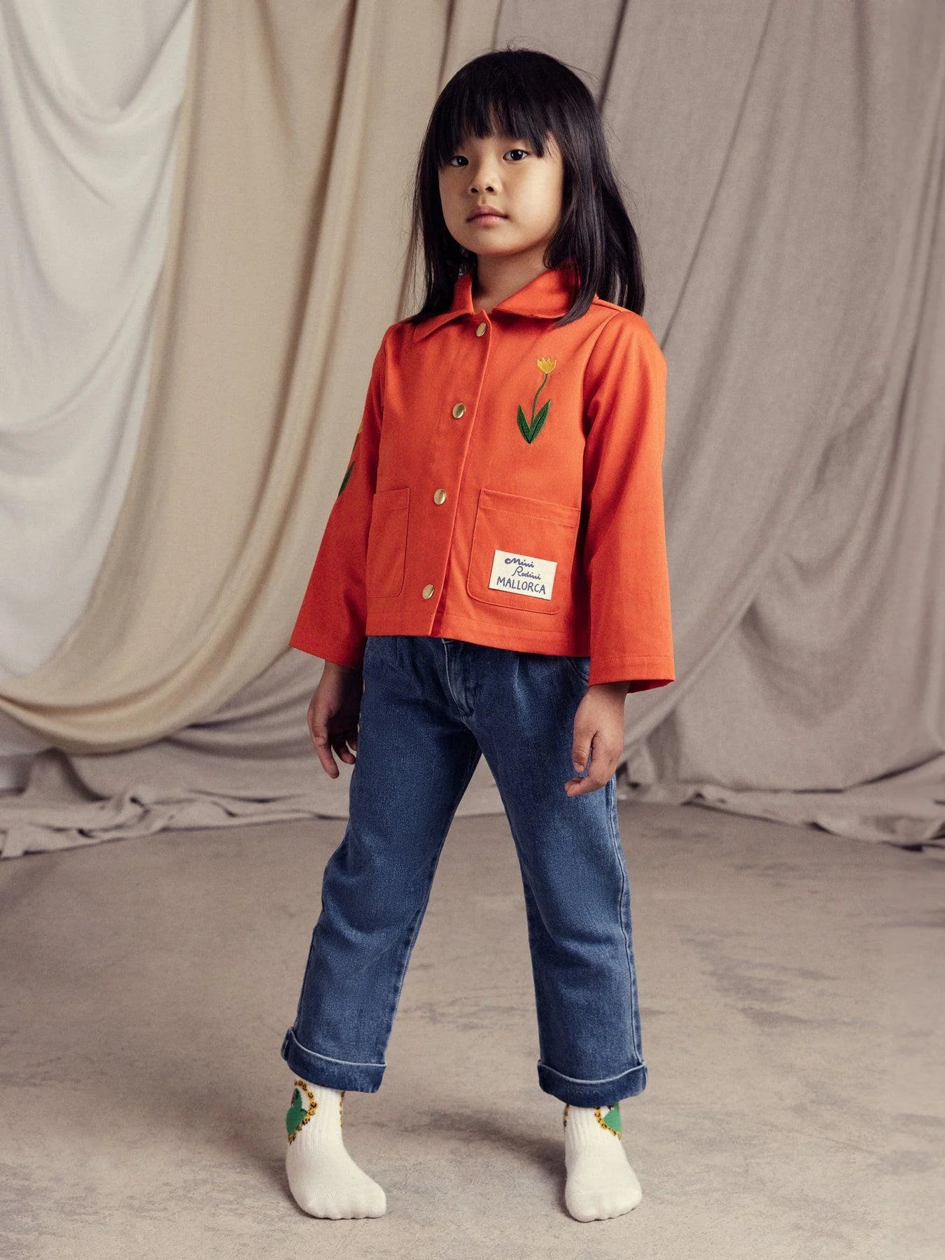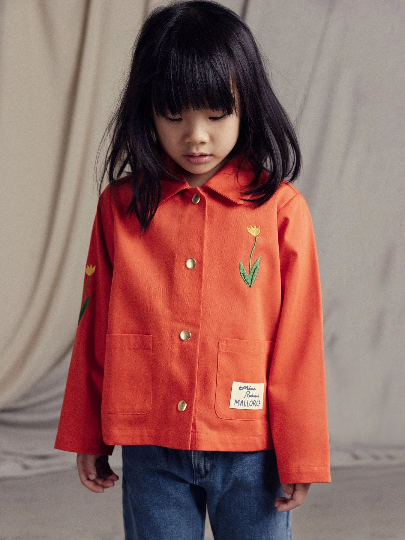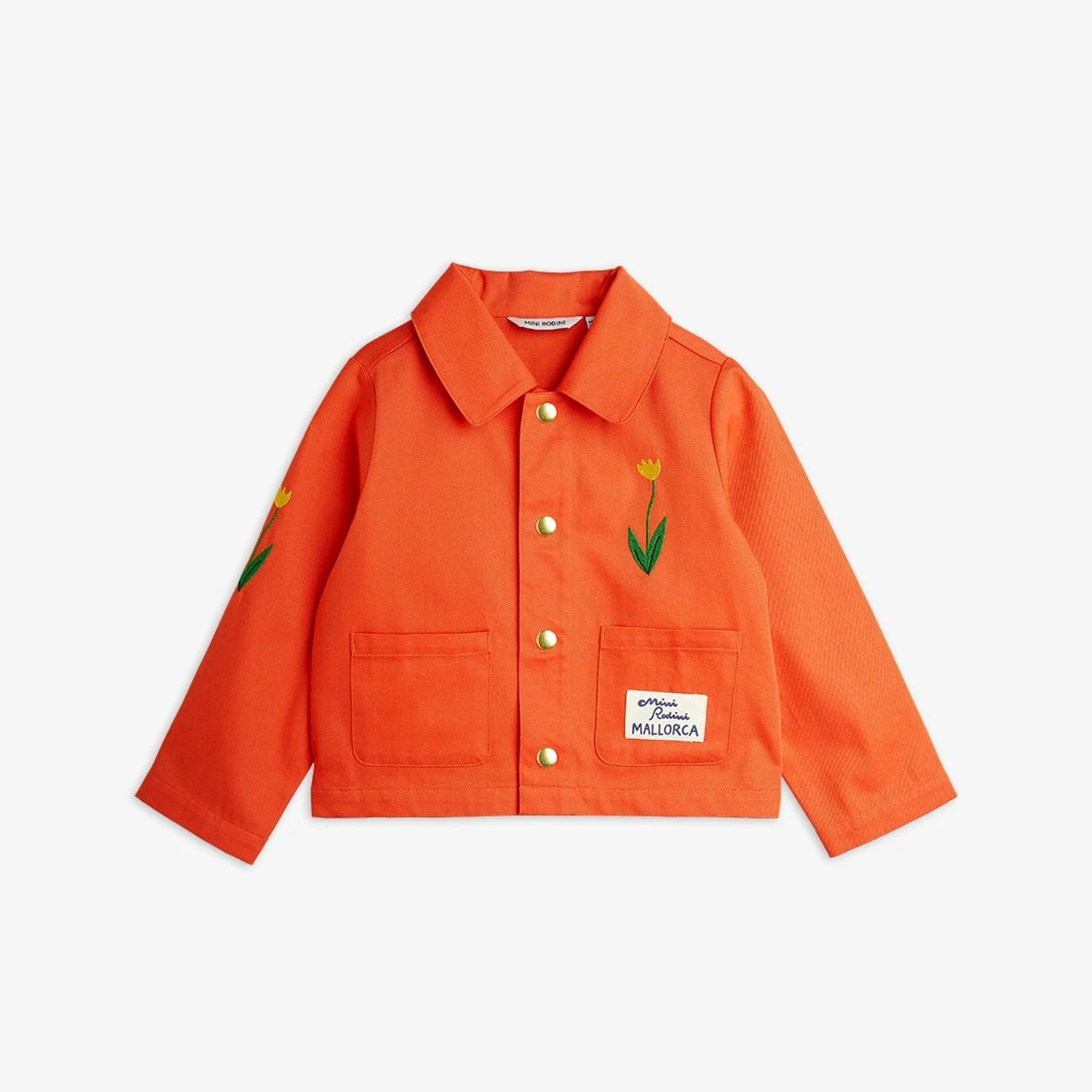 Chore coat made from 100 % GOTS certified organic cotton twill. Decorated with a sewn on Mallorca patch on the left front pocket, along with embroidered Flower motifs on the chest and right sleeve. The jacket features two front pockets, a snap button closure and a pointed collar.