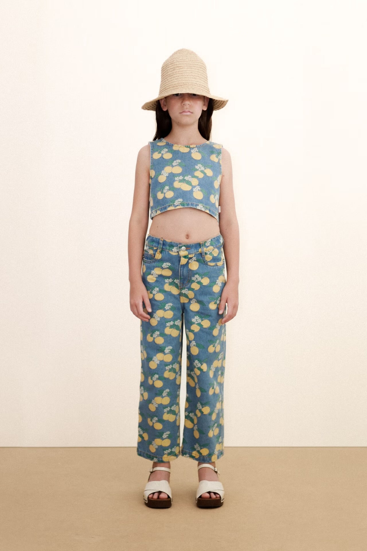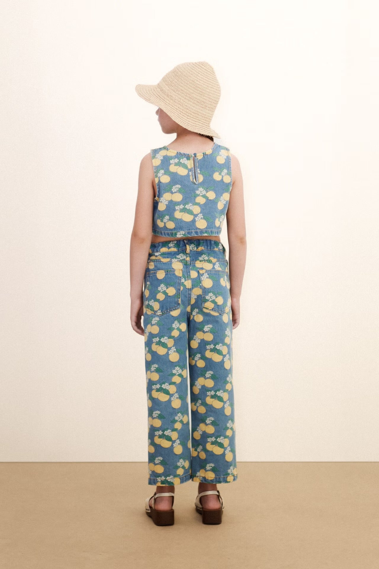 This sleeveless cropped denim top with an Oranges print combines freshness and style in a versatile piece. Featuring a round neckline and a back neck opening for added comfort, it offers a comfortable, airy look, perfect for warmer days.