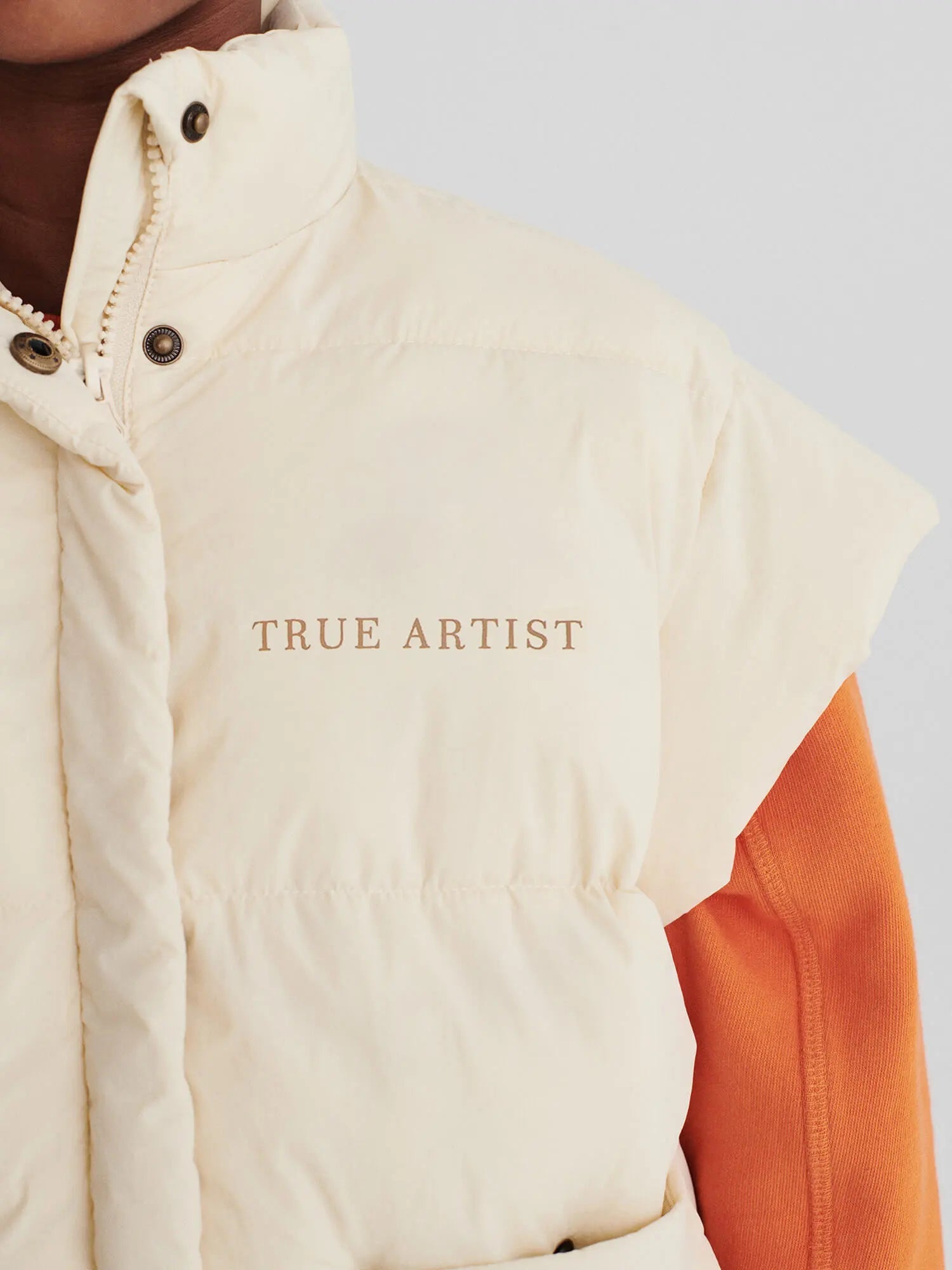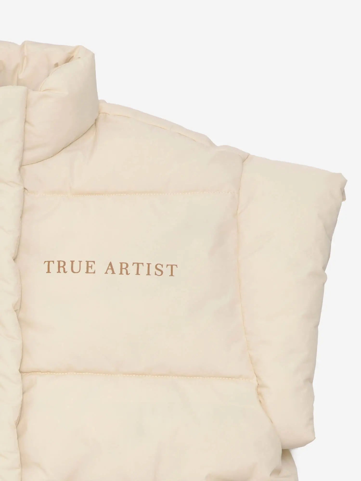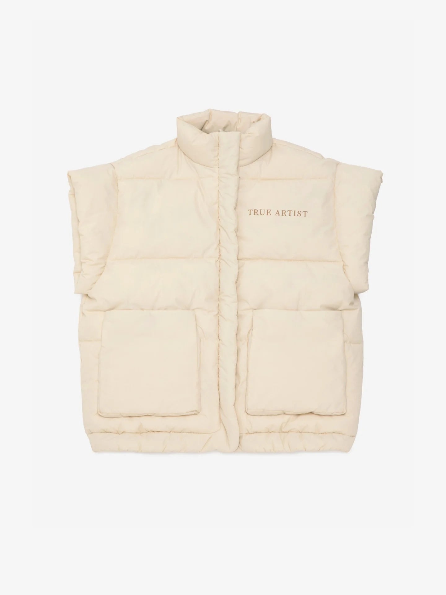 Padded Vest nº04 in Oatmeal is made of 100% polyamide. This vest features our TRUE ARTIST print on the chest and is designed with front zipper fastening and patch pockets at the front. Its filling is made of 100% polyester. It has a relaxed fit. Made in China.