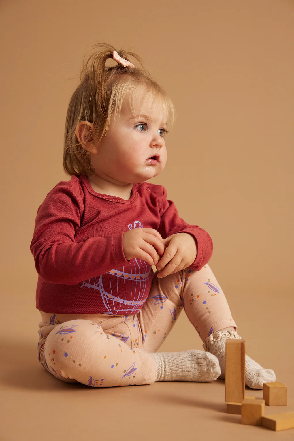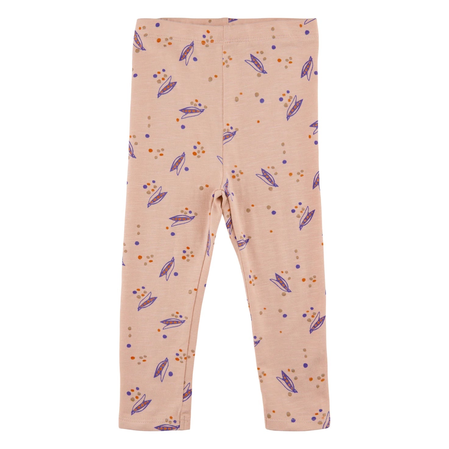 Rose leggings for babies and toddlers, featuring a hand illustrated AOP of peas. Its design is inspired by the timeless fairytales that bring generations together, make us wonder, and ignite our imagination. Golden glitter finish on parts of the AOP gives the leggings a playful and feminine look. These leggings offer an adorable look and ensure ease of movement for your little one. Made from high quality organic cotton, the leggings are soft, breathable, and gentle to the skin.