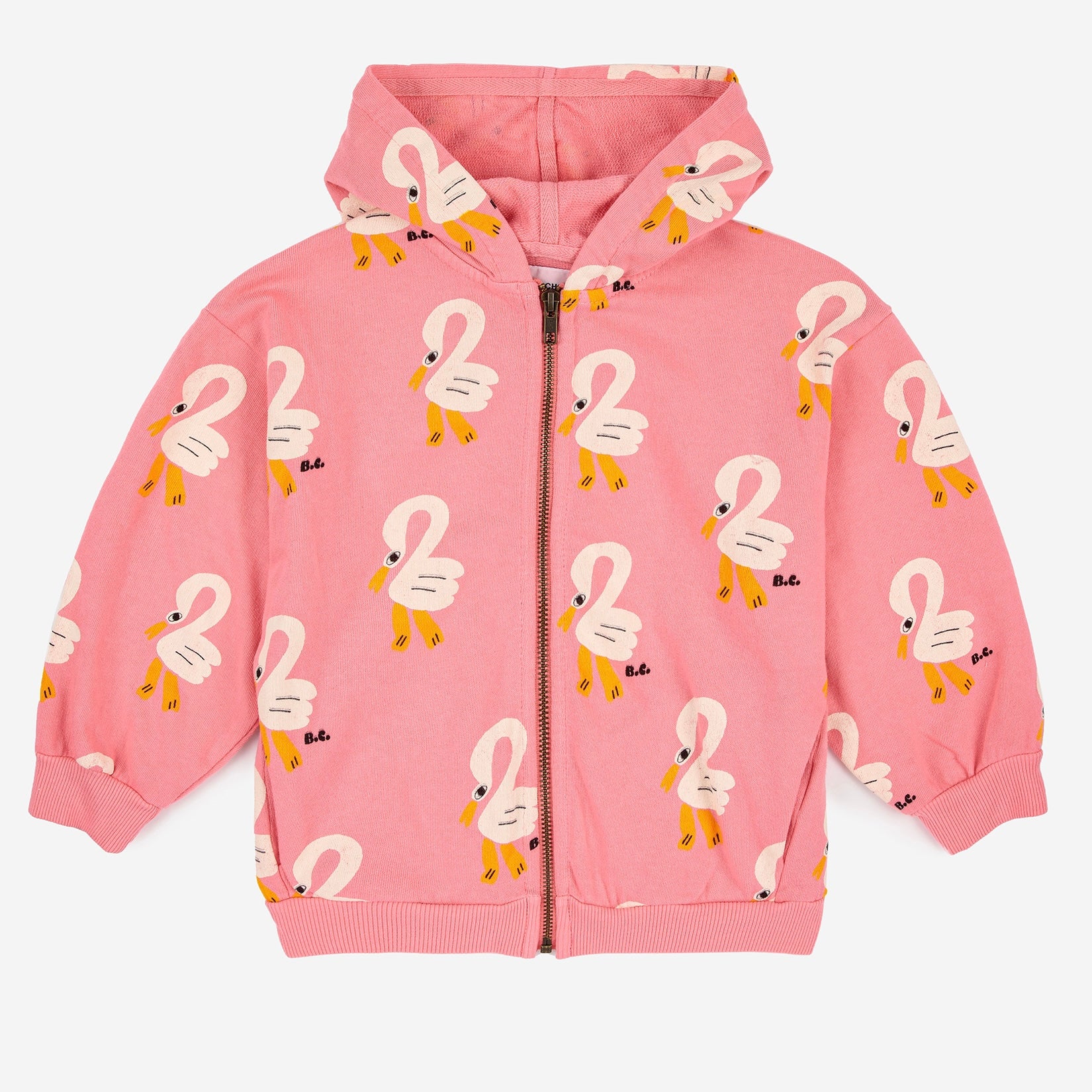 100% organic cotton pink zipped sweatshirt. Designed with hooded, long sleeves, front zip fastening, ribbed cuffs, ribbed bottom, seam pocket and fleece. It has a loose fit.
