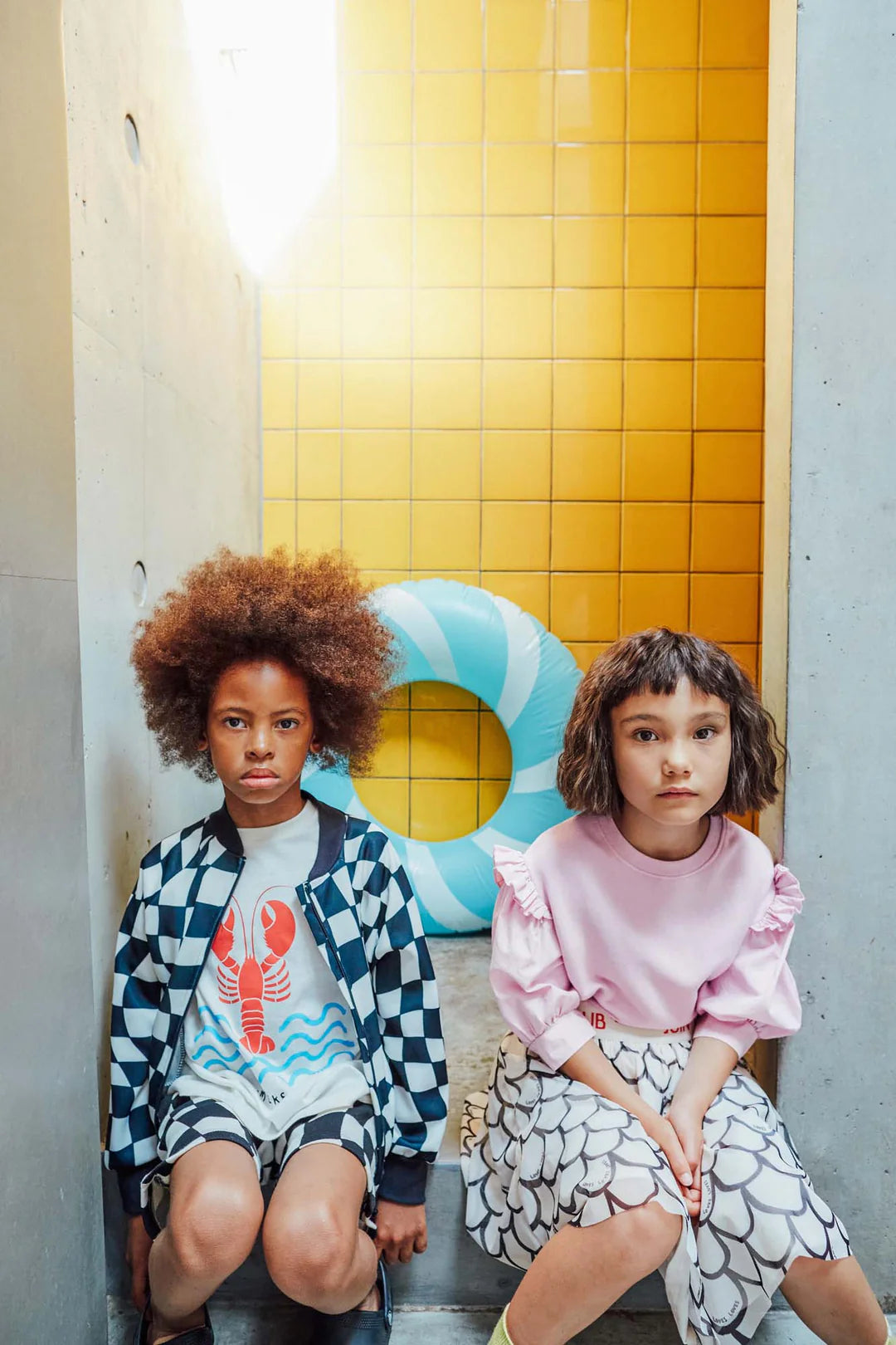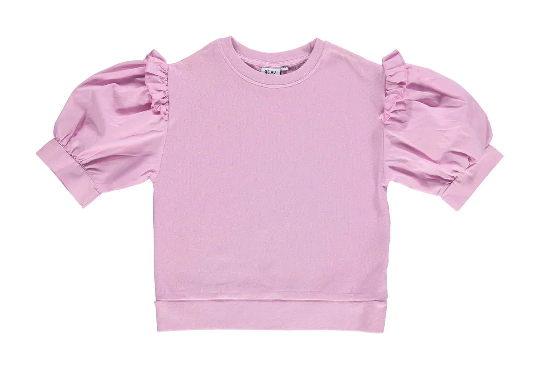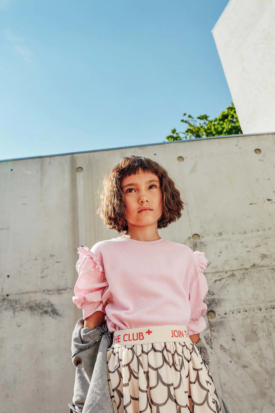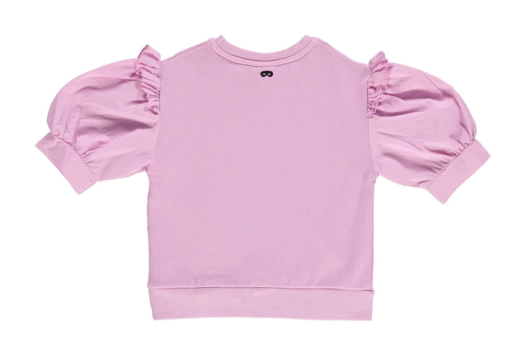 This summer weight, short sleeve sweater, with a soft frill detail, features a ribbed collar and cuff, and our signature embroidered superhero mask at the nape of the neck.