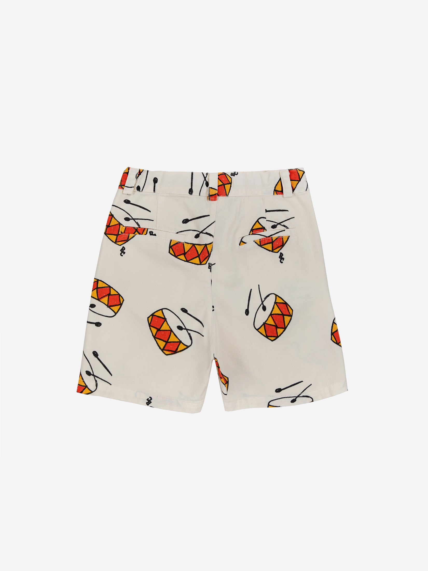 100% bci cotton offwhite shorts. Designed with regular crotch, adjustable waistband, front snap fastening, zipped, side pocket, loose fit, regular and over knee length