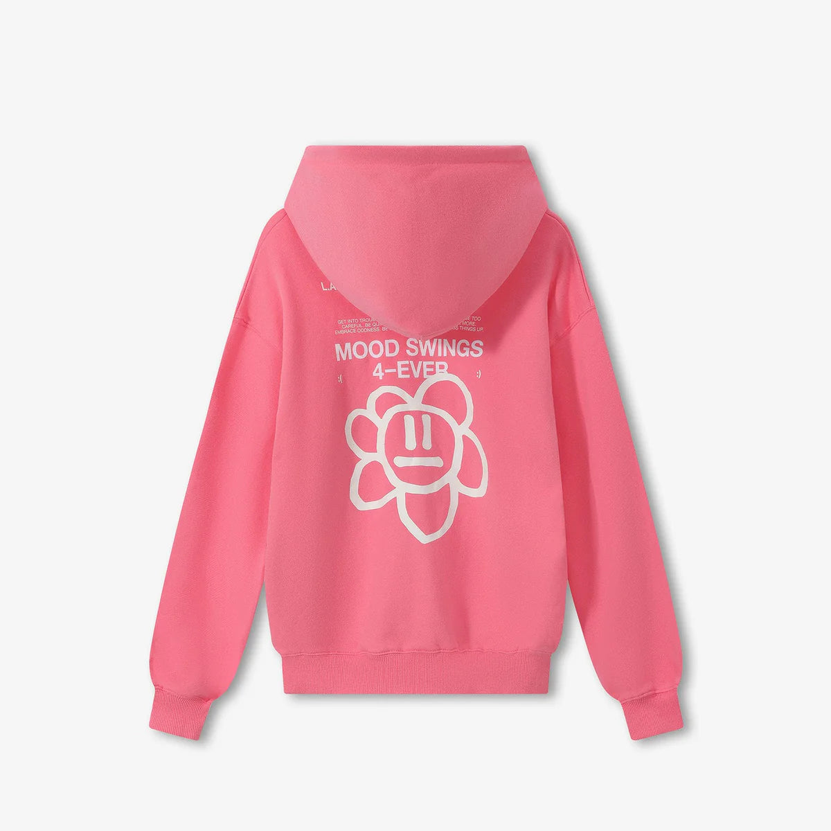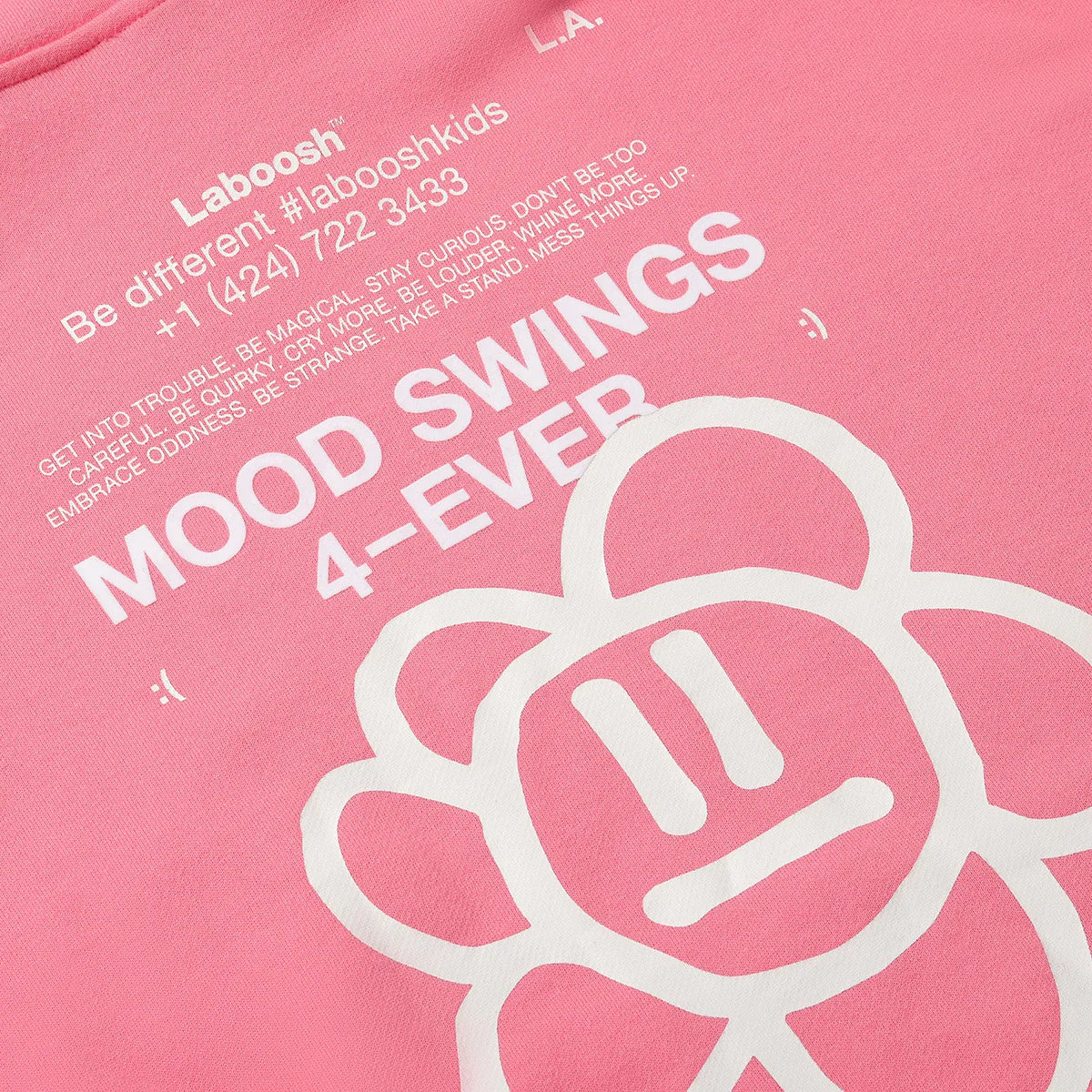- Moody Hoodie, super soft fabric, oversized fit, kangaroo pocket at the front, suede Laboosh print at the front and large white print on the back, "Moody" Flower in suede print, ribbed waistband and cuffs
