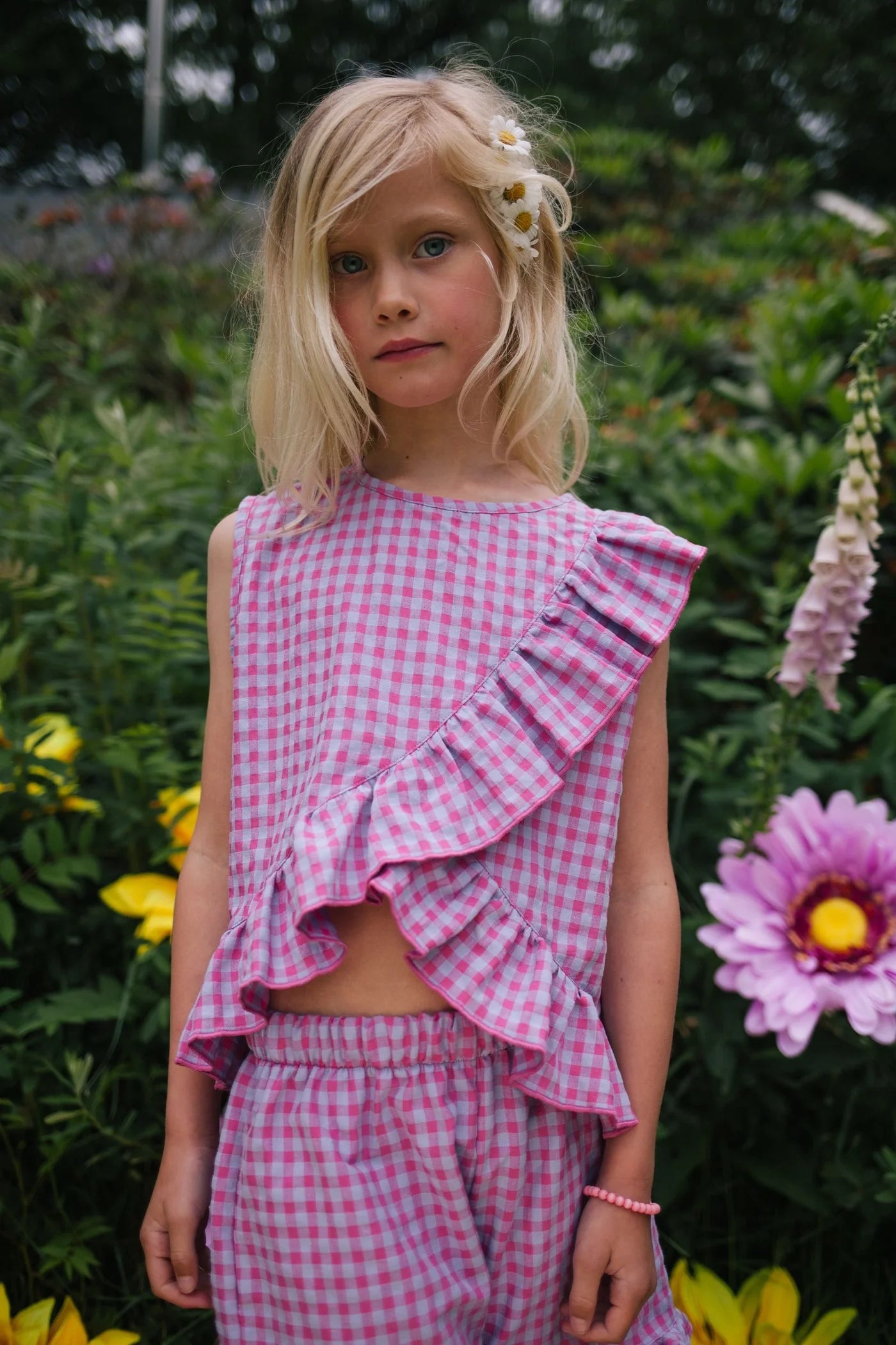 The Sassy shorts are designed with a checked print. Featuring frilled details and an elasticated waistband. Part of set with the Sassy top.