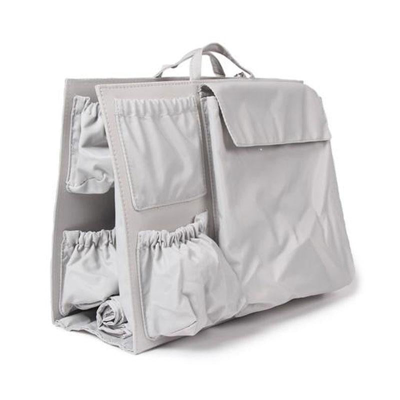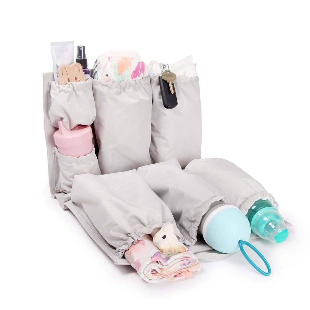 Removable organizer insert with 11 total pockets including an insulated pocket, key clasp, and washable changing mat. ToteSavvy original is best suited for large totes and oversized handbags. Made from wipeable nylon material.