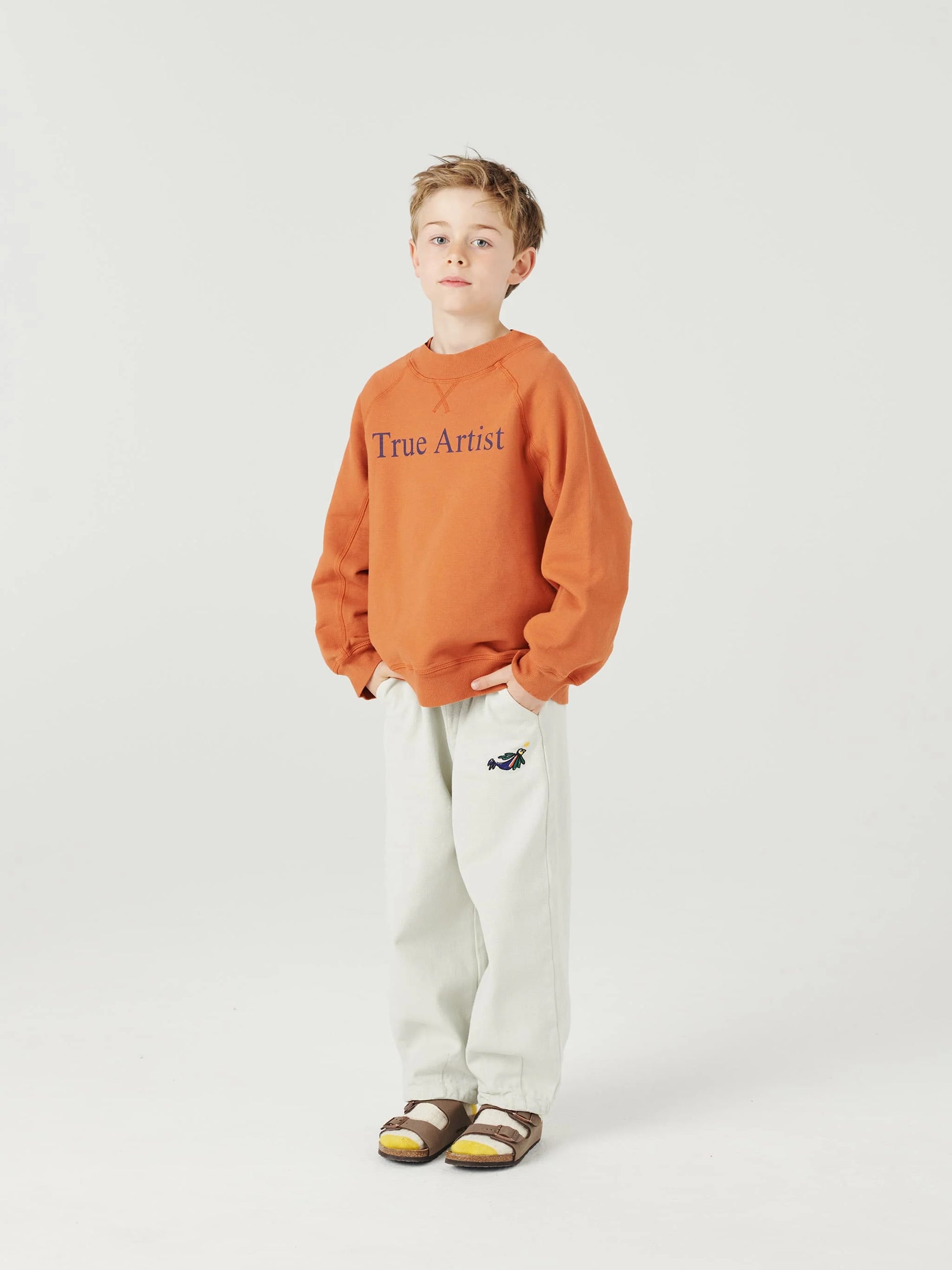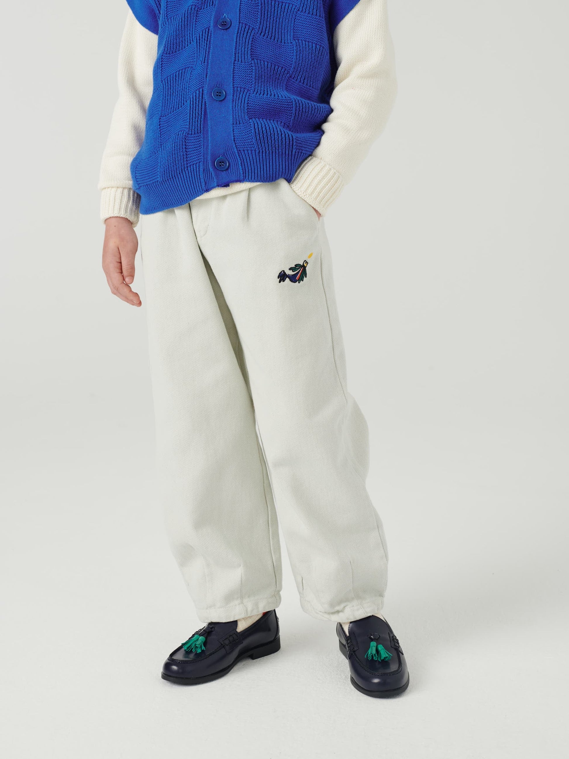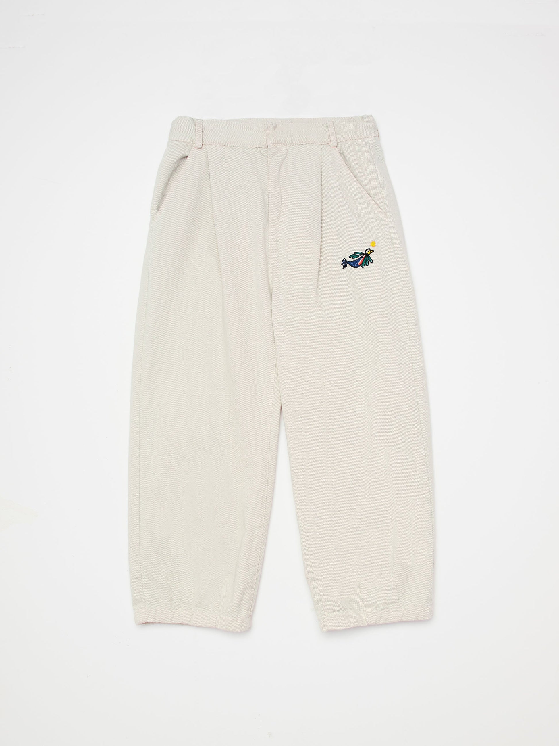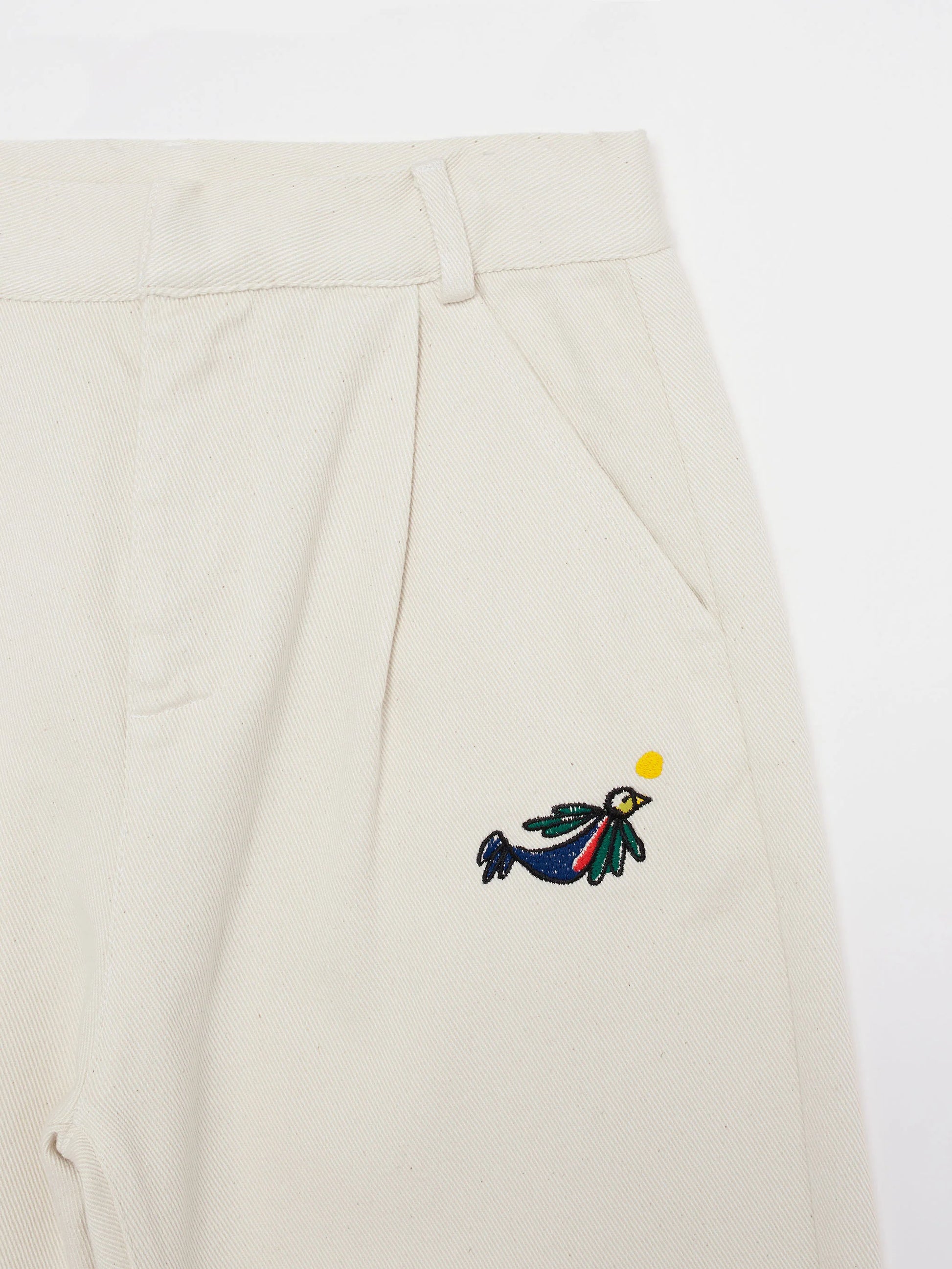 Trousers nº01 in Marble White are made of 100% cotton and have a multicolor bird embroidered on the front. These slouchy chino pants are designed with adjustable waistband, slash pipped pockets and front zip and button fastening. They have a cocoon fit. Made in Spain.