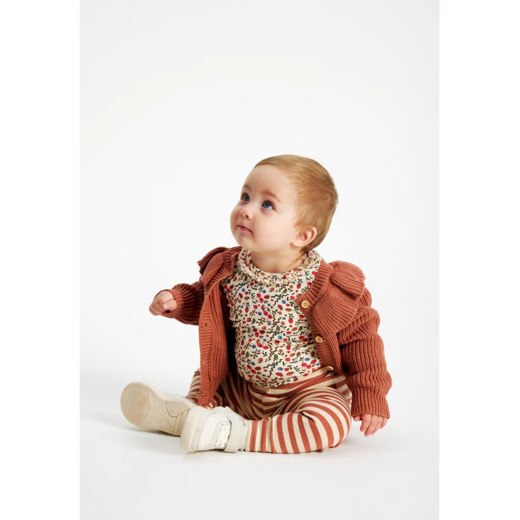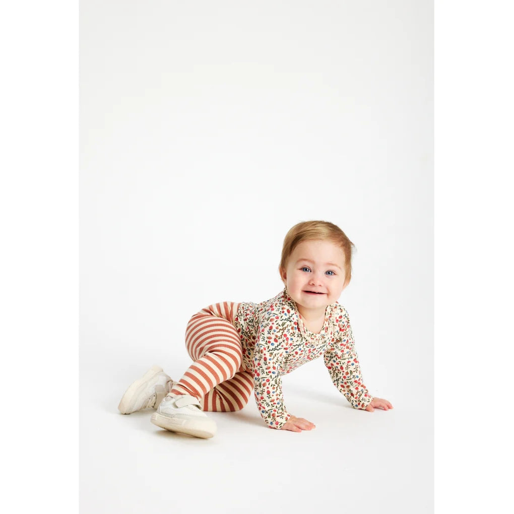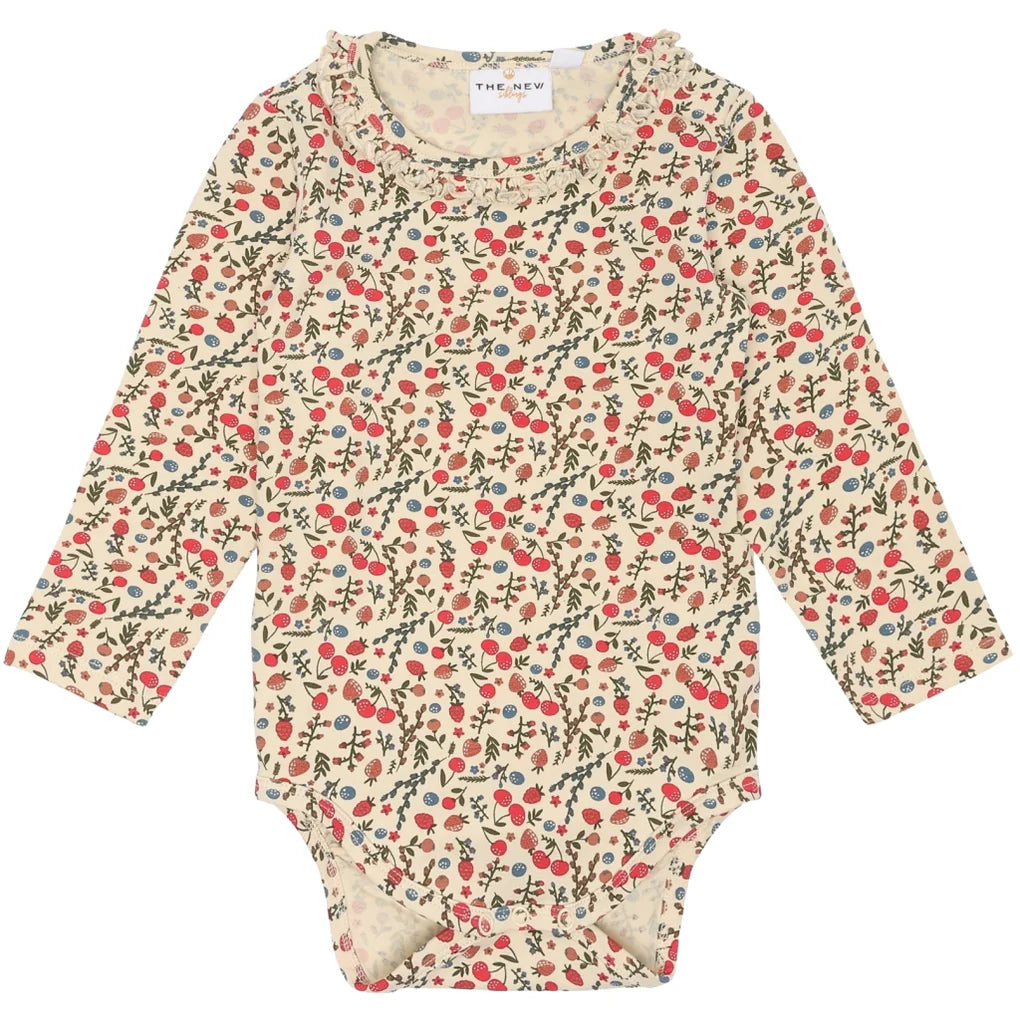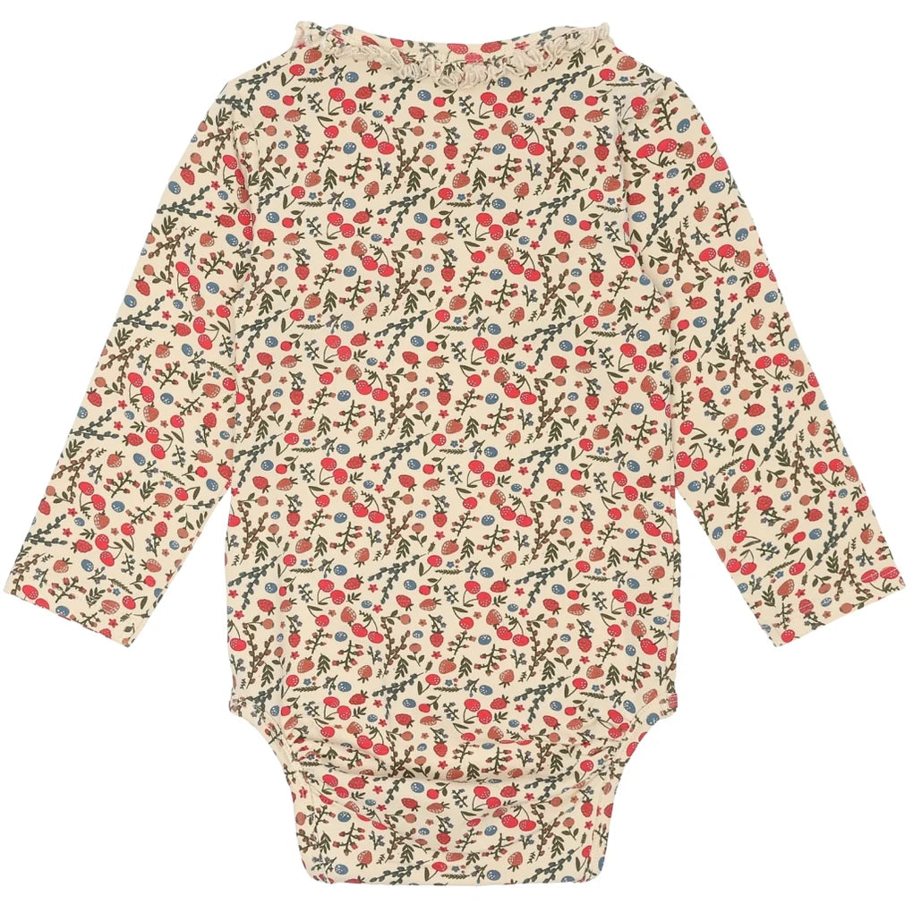 Long-sleeved baby bodysuit with a sweet and colorful all-over print pattern of cherries, strawberries, and small flowers. This charming bodysuit from THE NEW siblings is made of organic cotton to avoid harmful chemicals and make it soft and breathable. We've also added 5% stretch, so your child has freedom and comfort for play and exploration. Pair it with the matching TNSLayanara leggings for an adorable set.